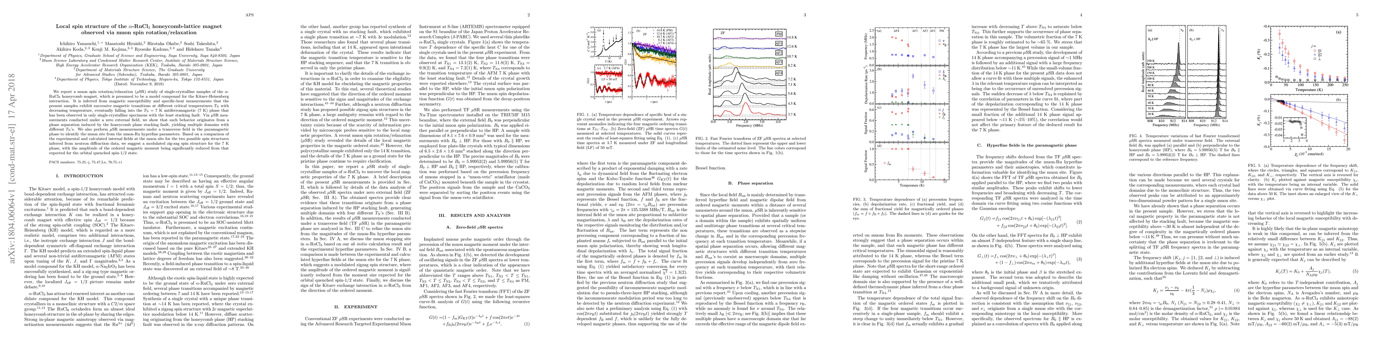 We report a muon spin rotation/relaxation ($\mu$SR) study of single-crystalline samples of the $\alpha$-RuCl$_3$ honeycomb magnet, which is presumed to be a model compound for the Kitaev-Heisenberg interaction. It is inferred from magnetic susceptibility and specific-heat measurements that the present samples exhibit successive magnetic transitions at different critical temperatures $T_{\rm N}$ with decreasing temperature, eventually falling into the $T_{\rm N}=7$ K antiferromagnetic (7 K) phase that has been observed in only single-crystalline specimens with the least stacking fault. Via $\mu$SR measurements conducted under a zero external field, we show that such behavior originates from a phase separation induced by the honeycomb plane stacking fault, yielding multiple domains with different $T_{\rm N}$'s. We also perform $\mu$SR measurements under a transverse field in the paramagnetic phase to identify the muon site from the muon-Ru hyperfine parameters. Based on a comparison of the experimental and calculated internal fields at the muon site for the two possible spin structures inferred from neutron diffraction data, we suggest a modulated zig-zag spin structure for the 7 K phase, with the amplitude of the ordered magnetic moment being significantly reduced from that expected for the orbital quenched spin-1/2 state.
