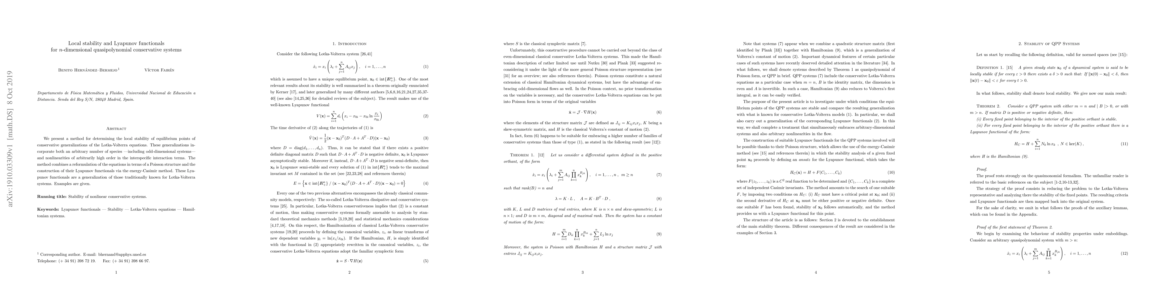 This paper develops a method for assessing local stability of equilibrium points in n-dimensional quasipolynomial conservative systems, generalizing Lotka-Volterra models. It utilizes a Poisson structure reformulation and energy-Casimir method to construct Lyapunov functionals, providing a robust framework for analyzing stability in complex ecological models.