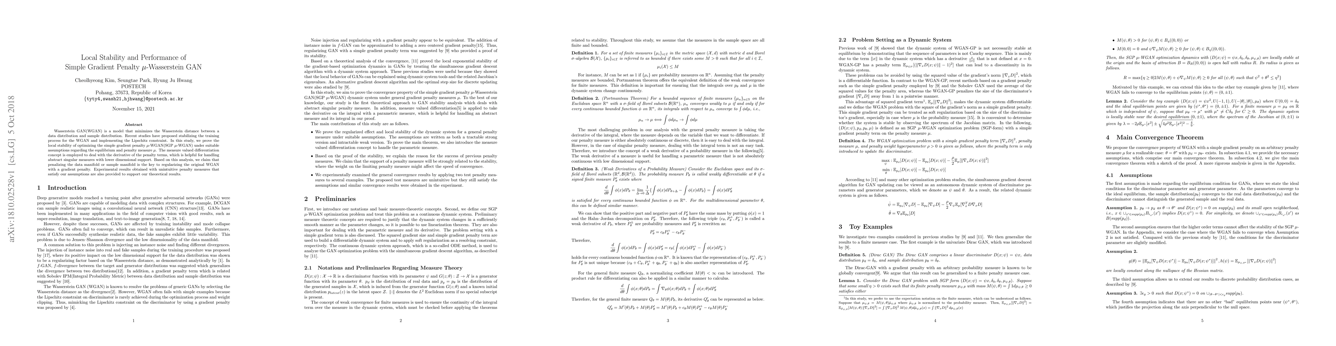 Wasserstein GAN(WGAN) is a model that minimizes the Wasserstein distance between a data distribution and sample distribution. Recent studies have proposed stabilizing the training process for the WGAN and implementing the Lipschitz constraint. In this study, we prove the local stability of optimizing the simple gradient penalty $\mu$-WGAN(SGP $\mu$-WGAN) under suitable assumptions regarding the equilibrium and penalty measure $\mu$. The measure valued differentiation concept is employed to deal with the derivative of the penalty terms, which is helpful for handling abstract singular measures with lower dimensional support. Based on this analysis, we claim that penalizing the data manifold or sample manifold is the key to regularizing the original WGAN with a gradient penalty. Experimental results obtained with unintuitive penalty measures that satisfy our assumptions are also provided to support our theoretical results.