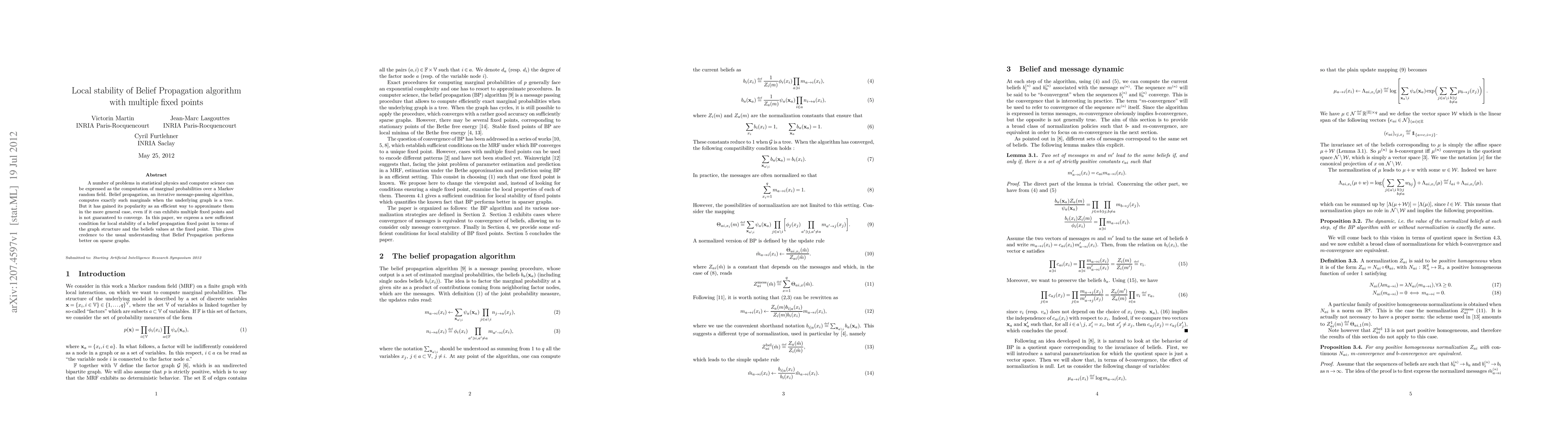 This paper proposes a new sufficient condition for the local stability of fixed points in the Belief Propagation algorithm, relating it to the graph structure and belief values. It supports the notion that Belief Propagation is more effective on sparse graphs.