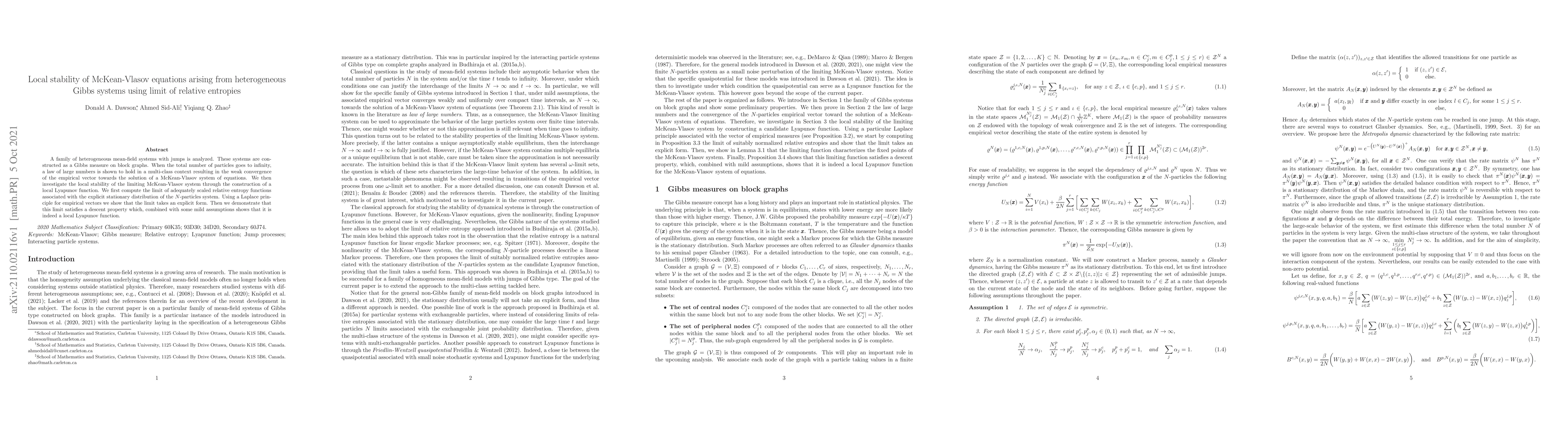 A family of heterogeneous mean-field systems with jumps is analyzed. These systems are constructed as a Gibbs measure on block graphs. When the total number of particles goes to infinity, a law of large numbers is shown to hold in a multi-class context resulting in the weak convergence of the empirical vector towards the solution of a McKean-Vlasov system of equations. We then investigate the local stability of the limiting McKean-Vlasov system through the construction of a local Lyapunov function. We first compute the limit of adequately scaled relative entropy functions associated with the explicit stationary distribution of the N-particles system. Using a Laplace principle for empirical vectors we show that the limit takes an explicit form. Then we demonstrate that this limit satisfies a descent property which, combined with some mild assumptions shows that it is indeed a local Lyapunov function.