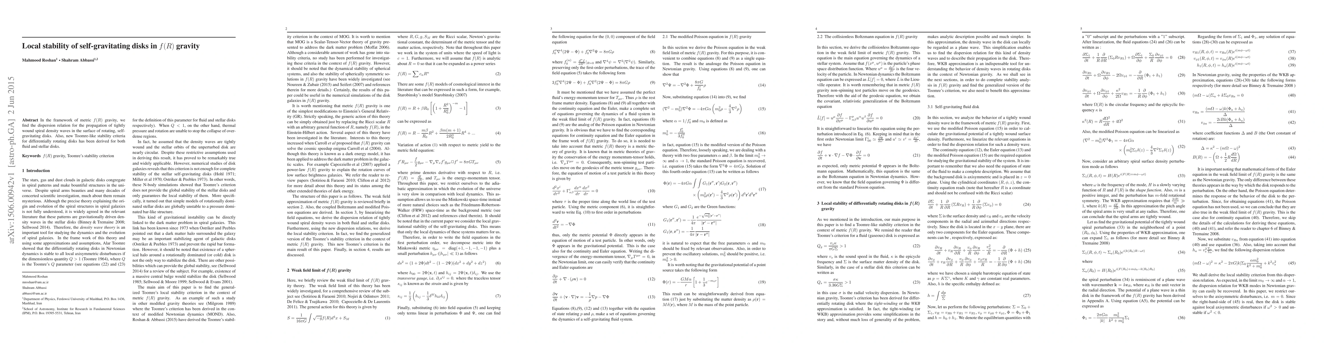 This paper investigates the local stability of rotating, self-gravitating disks in the context of $f(R)$ gravity, deriving a dispersion relation for spiral density waves and new Toomre-like stability criteria for differentially rotating fluid and stellar disks.