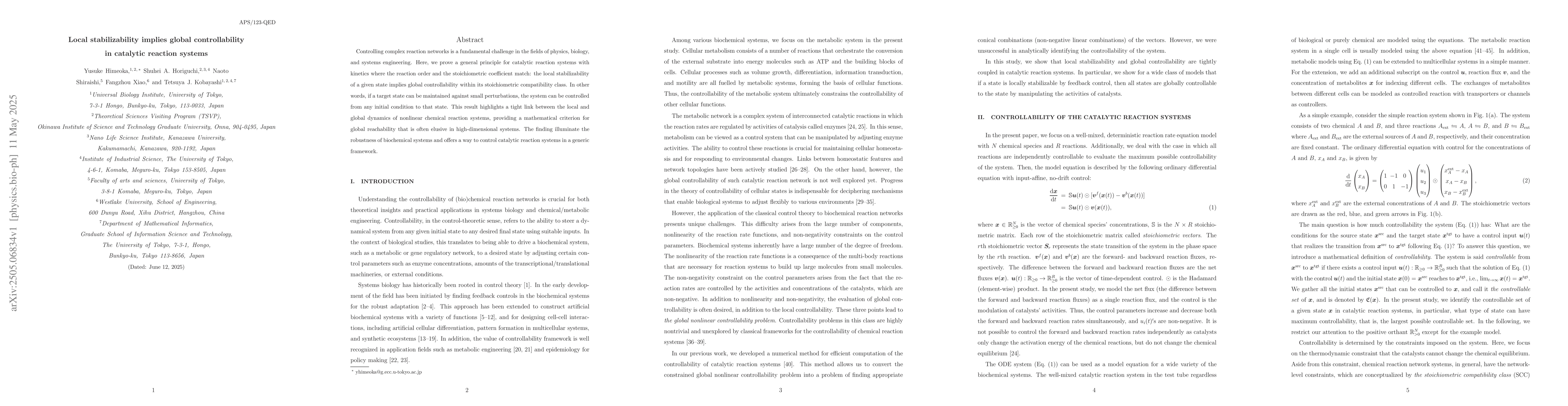 Local stabilizability in catalytic reaction systems implies global controllability, allowing control from any initial condition to a target state within its stoichiometric compatibility class.