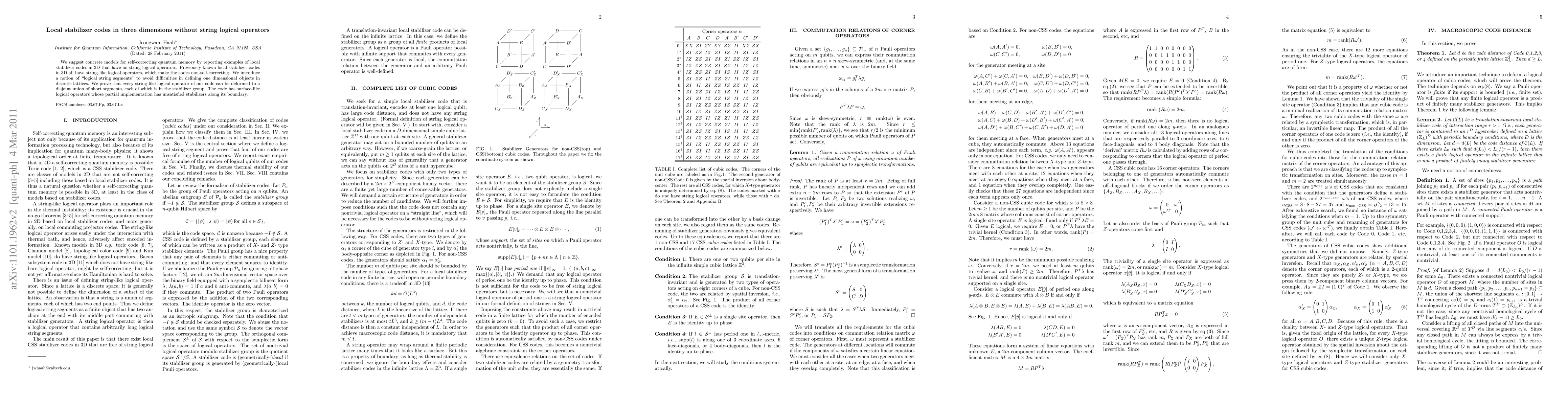 This paper proposes new models for self-correcting quantum memory in 3D using local stabilizer codes without string logical operators, addressing the issue of non-self-correcting codes previously known. It introduces "logical string segments" to avoid defining one-dimensional objects in lattices and proves that string-like logical operators can be decomposed into short, stabilizer-group segments.