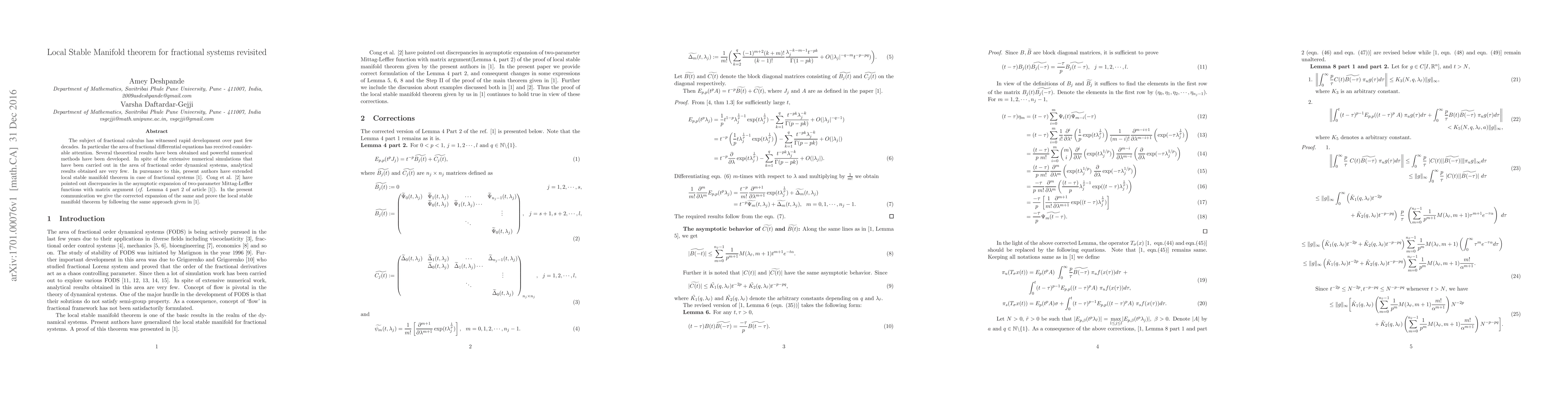 Researchers corrected discrepancies in asymptotic expansion of Mittag-Leffler functions for fractional systems, proving a local stable manifold theorem using the same approach as a previous paper.