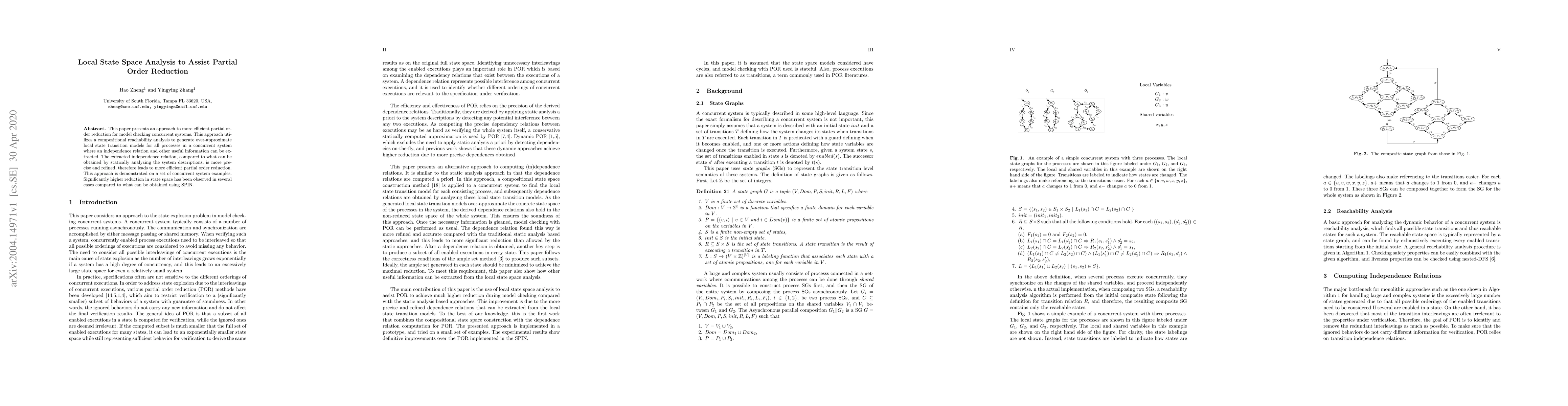 This paper proposes a method to reduce state space in model checking concurrent systems by generating over-approximate local state transition models using compositional reachability analysis. The approach leads to significantly higher reductions in state space than traditional methods like SPIN.