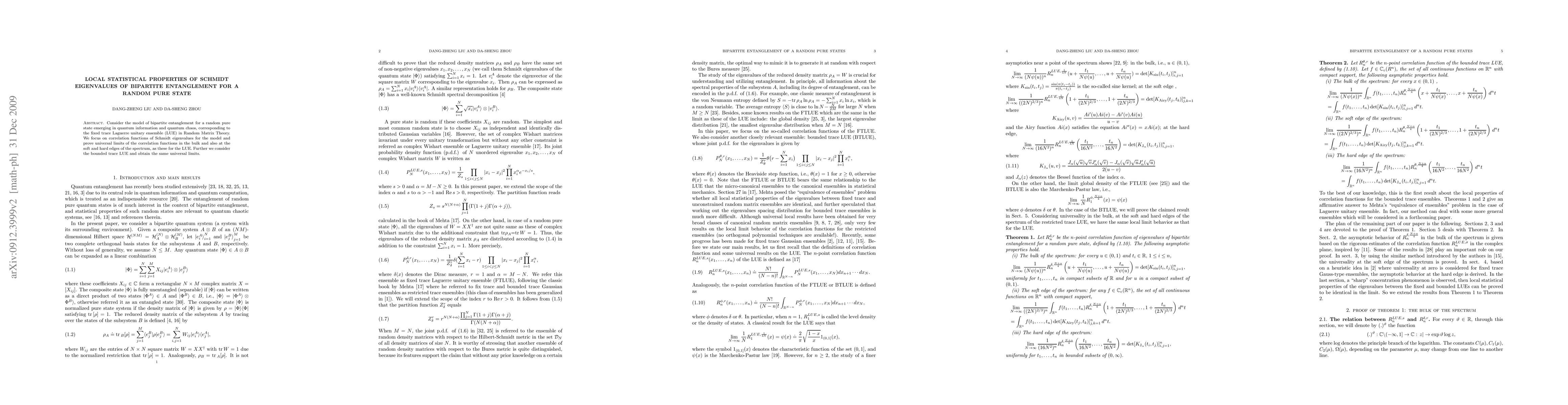 Consider the model of bipartite entanglement for a random pure state emerging in quantum information and quantum chaos, corresponding to the fixed trace Laguerre unitary ensemble (LUE) in Random Matrix Theory. We focus on correlation functions of Schmidt eigenvalues for the model and prove universal limits of the correlation functions in the bulk and also at the soft and hard edges of the spectrum, as these for the LUE. Further we consider the bounded trace LUE and obtain the same universal limits.