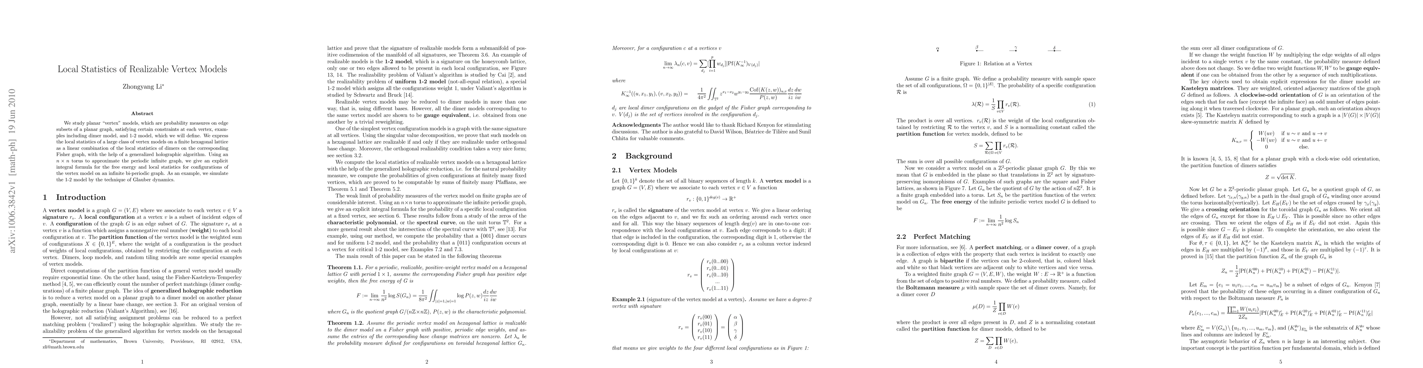 This research paper introduces a method to express local statistics of a wide range of vertex models on finite hexagonal lattices as a combination of dimer local statistics on corresponding Fisher graphs. Utilizing a generalized holographic algorithm and an n×n torus approximation for periodic infinite graphs, the paper provides an explicit integral formula for free energy and local statistics of vertex model configurations on infinite bi-periodic graphs. The 1-2 model is simulated using Glauber dynamics as an example.