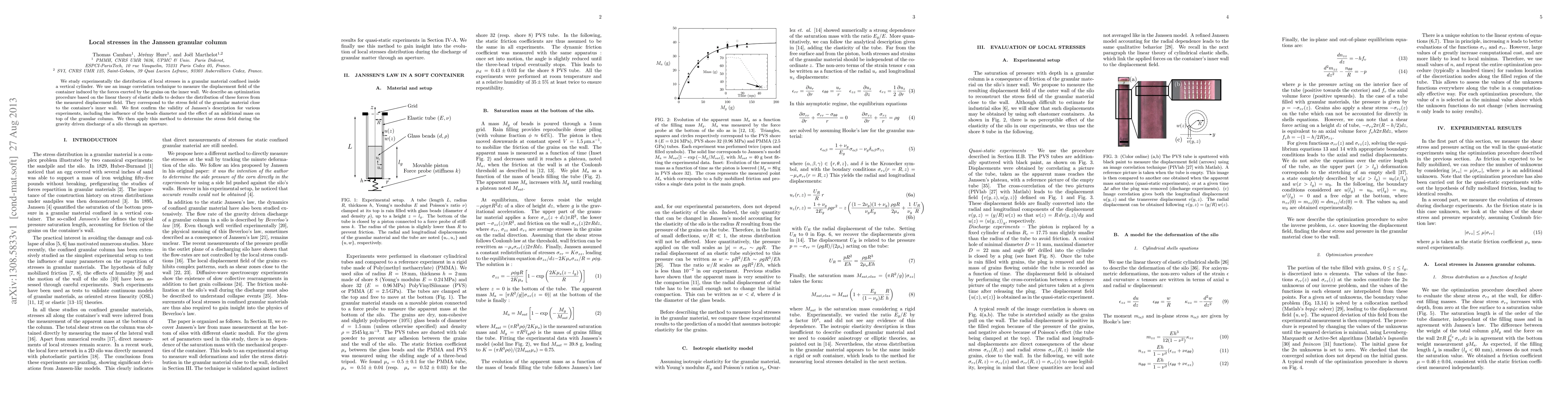 This research uses image correlation to measure displacements in a granular material within a vertical cylinder, deriving local stress distribution via an optimization procedure based on elastic shell theory. It validates Janssen's model with varying bead sizes and additional masses, then applies the method to analyze stress during gravity-driven silo discharge through an aperture.