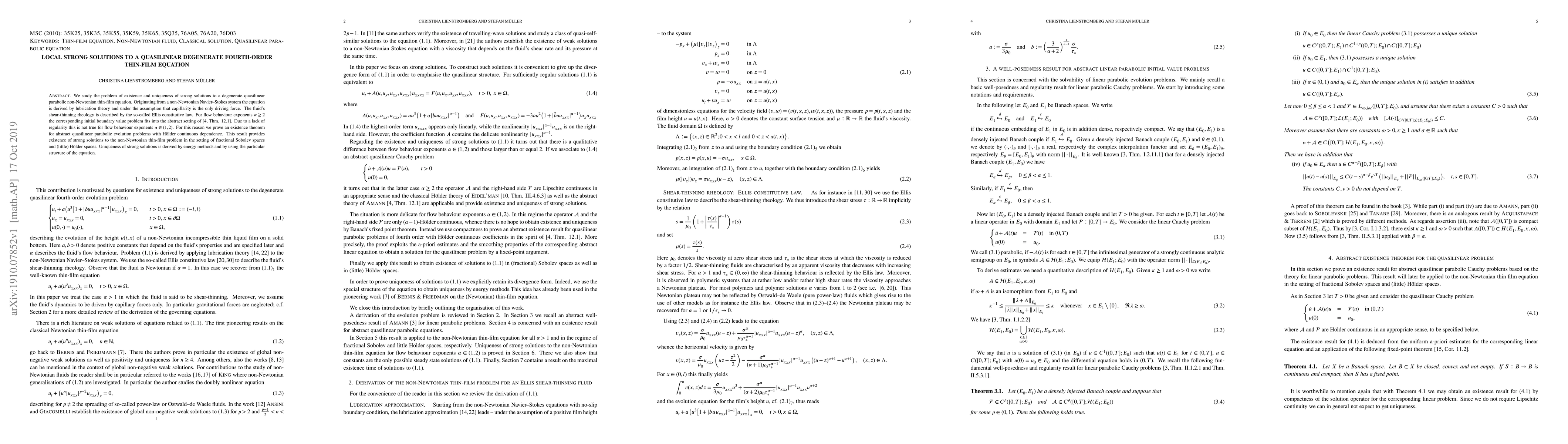 We study the problem of existence and uniqueness of strong solutions to a degenerate quasilinear parabolic non-Newtonian thin-film equation. Originating from a non-Newtonian Navier--Stokes system the equation is derived by lubrication theory and under the assumption that capillarity is the only driving force. The fluid's shear-thinning rheology is described by the so-called Ellis constitutive law. For flow behaviour exponents $\alpha \geq 2$ the corresponding initial boundary value problem fits into the abstract setting of [4,Thm. 12.1]. Due to a lack of regularity this is not true for flow behaviour exponents $\alpha \in (1,2)$. For this reason we prove an existence theorem for abstract quasilinear parabolic evolution problems with H\"older continuous dependence. This result provides existence of strong solutions to the non-Newtonian thin-film problem in the setting of fractional Sobolev spaces and (little) H\"older spaces. Uniqueness of strong solutions is derived by energy methods and by using the particular structure of the equation.