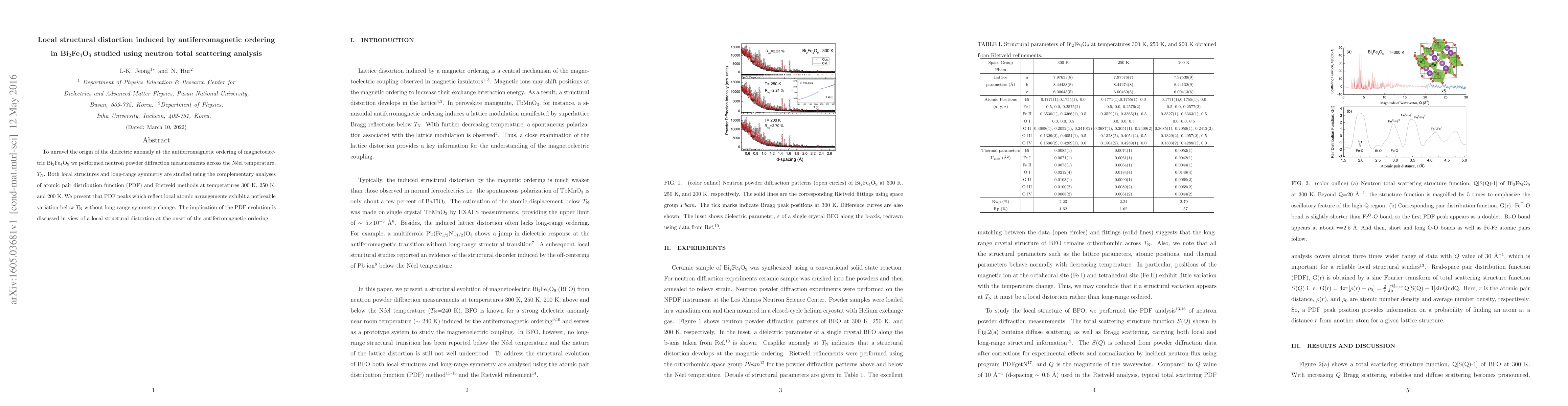 To unravel the origin of the dielectric anomaly at the antiferromagnetic ordering of magnetoelectric Bi$_2$Fe$_4$O$_9$ we performed neutron powder diffraction measurements across the N$\acute{\rm e}$el temperature, $T_{\rm N}$. Both local structures and long-range symmetry are studied using the complementary analyses of atomic pair distribution function (PDF) and Rietveld methods at temperatures 300~K, 250~K, and 200~K. We present that PDF peaks which reflect local atomic arrangements exhibit a noticeable variation below $T_{\rm N}$ without long-range symmetry change. The implication of the PDF evolution is discussed in view of a local structural distortion at the onset of the antiferromagnetic ordering.