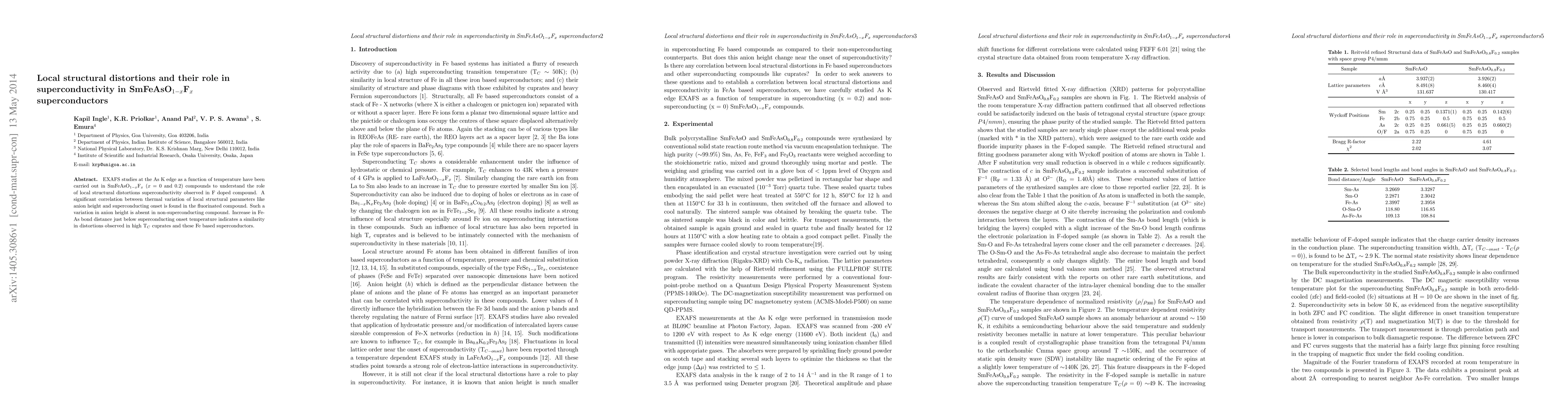This research investigates local structural distortions in SmFeAsO$_{1-x}$F$_x$ superconductors using EXAFS at the As K edge, finding a strong correlation between thermal variations in anion height and superconductivity onset in fluorinated compounds, with increased Fe-As bond distance mirroring distortions seen in high-T$_C$ cuprates.