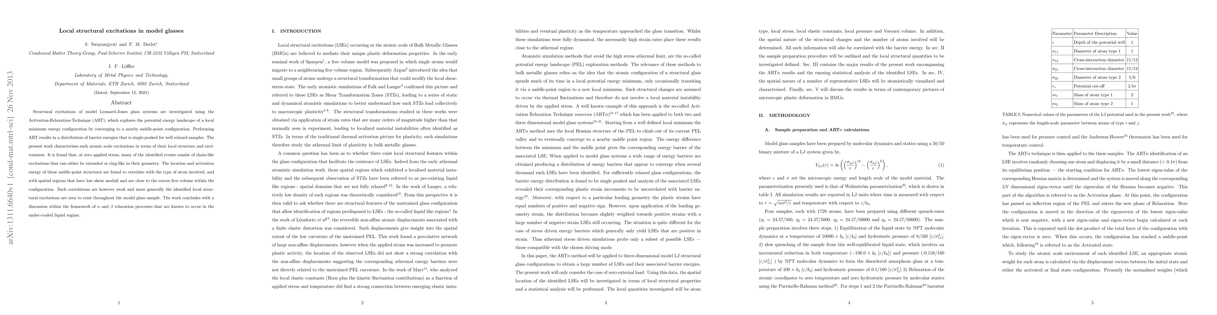 Structural excitations of model Lennard-Jones glass systems are investigated using the Activation-Relaxation-Technique (ART), which explores the potential energy landscape of a local minimum energy configuration by converging to a nearby saddle-point configuration. Performing ART results in a distribution of barrier energies that is single-peaked for well relaxed samples. The present work characterises such atomic scale excitations in terms of their local structure and environment. It is found that, at zero applied stress, many of the identified events consist of chain-like excitations that can either be extended or ring-like in their geometry. The location and activation energy of these saddle-point structures are found to correlate with the type of atom involved, and with spatial regions that have low shear moduli and are close to the excess free volume within the configuration. Such correlations are however weak and more generally the identified local structural excitations are seen to exist throughout the model glass sample. The work concludes with a discussion within the framework of $\alpha$ and $\beta$ relaxation processes that are known to occur in the under-cooled liquid regime.