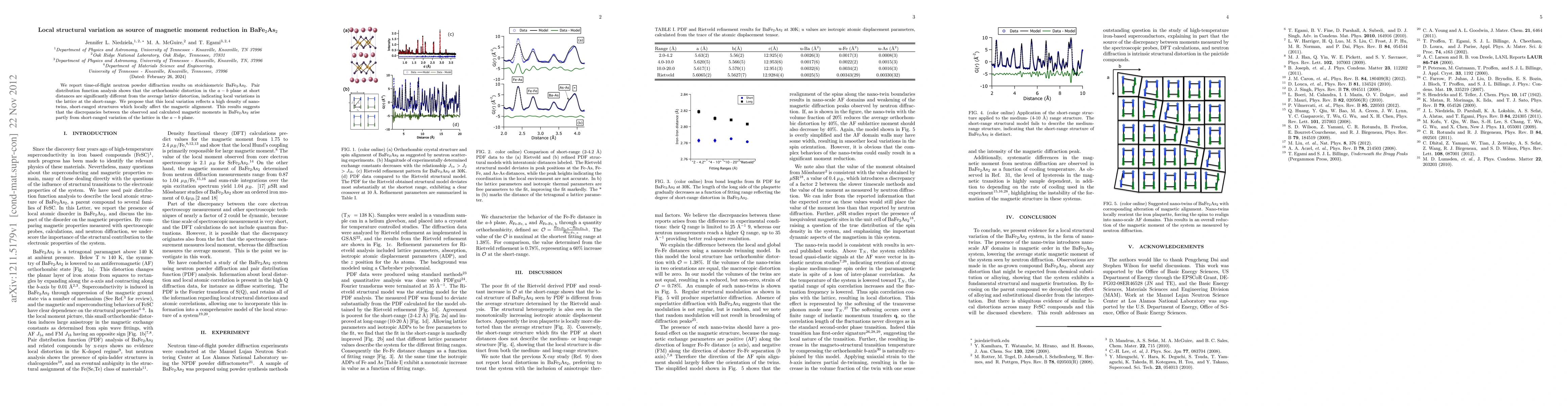 This study reveals that local structural variations, specifically orthorhombic distortions in the BaFe2As2 lattice, lead to a reduction in magnetic moment. The findings suggest that nano-twins and short-ranged structures contribute to these local distortions, explaining discrepancies between observed and calculated magnetic moments.
