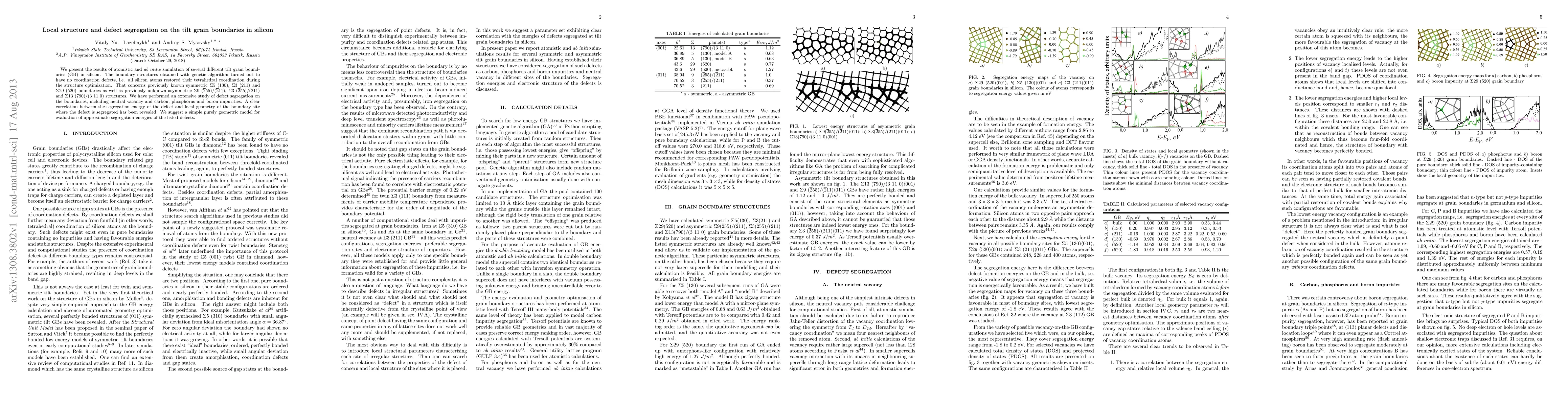 We present the results of atomistic and ab initio simulation of several different tilt grain boundaries (GB) in silicon. The boundary structures obtained with genetic algorithm turned out to have no coordination defects, i.e. all silicon atoms restored their tetrahedral coordination during the structure optimisation. That concerns previously known symmetric {\Sigma} 5 (130), {\Sigma} 3 (211) and {\Sigma} 29 (520) boundaries as well as previously unknown asymmetric {\Sigma} 9 (-255)/(-211), {\Sigma} 3 (-255)/(211) and {\Sigma} 13 (790)/(3 11 0) structures. We have performed an extensive study of defect segregation on the boundaries, including neutral vacancy and carbon, phosphorus and boron impurities. A clear correlation between the segregation energy of the defect and local geometry of the boundary site where the defect is segregated has been revealed. We suggest a simple purely geometric model for evaluation of approximate segregation energies of the listed defects.