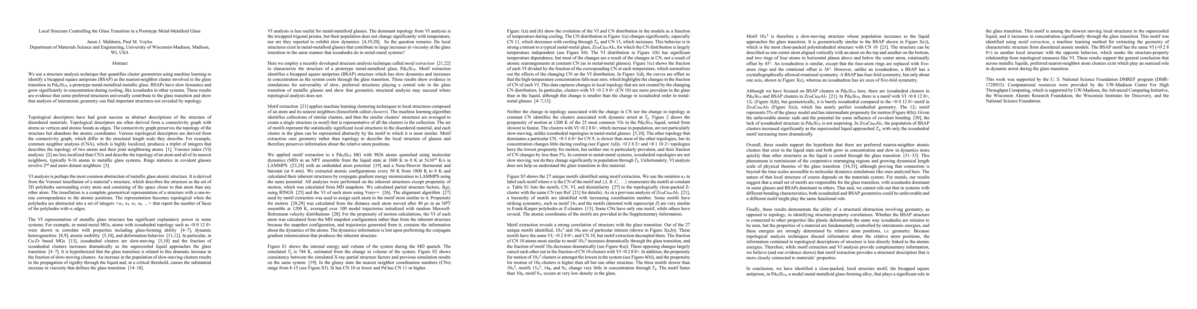 We use a structure analysis technique that quantifies cluster geometries using machine learning to identify a bicapped square antiprism (BSAP) as the nearest-neighbor cluster involved in the glass transition in Pd82Si18, a prototype metal-metalloid metallic glass. BSAPs have slow dynamics and grow significantly in concentration during cooling, like icosahedra in other systems. These results are evidence that some preferred structures universally contribute to the glass transition and show that analysis of interatomic geometry can find important structures not revealed by topology.