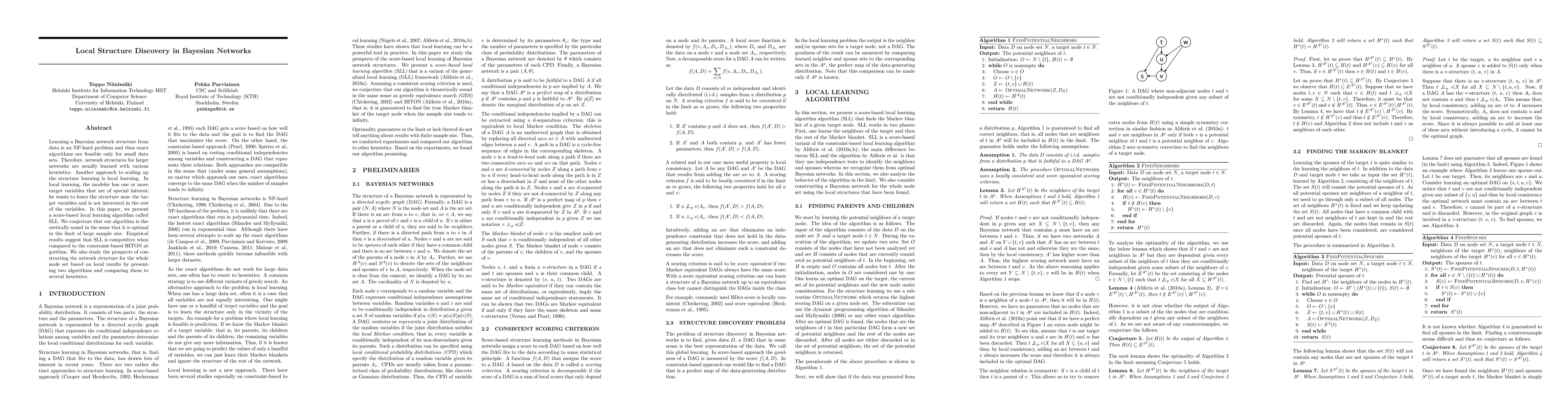 This paper introduces a score-based local learning algorithm, SLL, for discovering Bayesian network structures around target variables, demonstrating its competitiveness against the HITON algorithm. It also explores constructing global network structures from local results using two additional algorithms.
