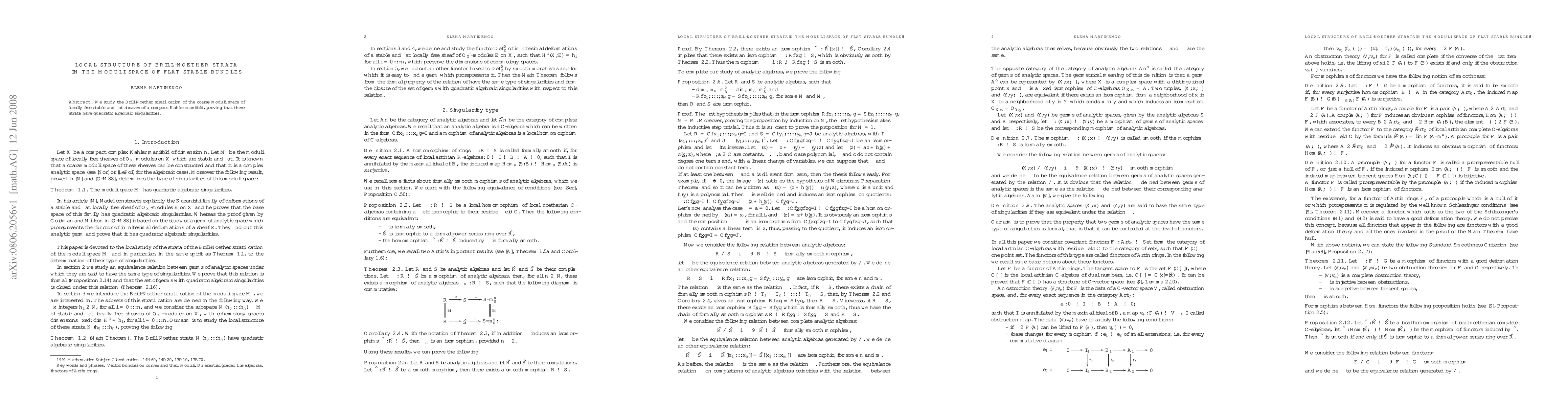 Summary: This paper investigates the Brill-Noether stratification of flat stable bundles on compact Kähler manifolds, establishing that the strata exhibit quadratic algebraic singularities. The study focuses on the local structure within the moduli space.