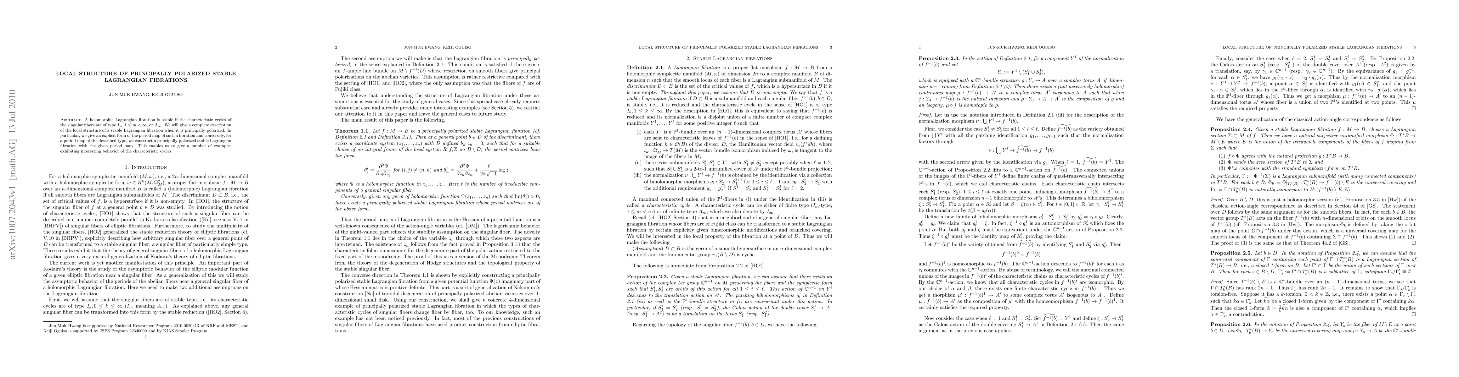 A holomorphic Lagrangian fibration is stable if the characteristic cycles of the singular fibers are of type $I_m, 1 \leq m <\infty,$ or $A_{\infty}$. We will give a complete description of the local structure of a stable Lagrangian fibration when it is principally polarized. In particular, we give an explicit form of the period map of such a fibration and conversely, for a period map of the described type, we construct a principally polarized stable Lagrangian fibration with the given period map. This enables us to give a number of examples exhibiting interesting behavior of the characteristic cycles.