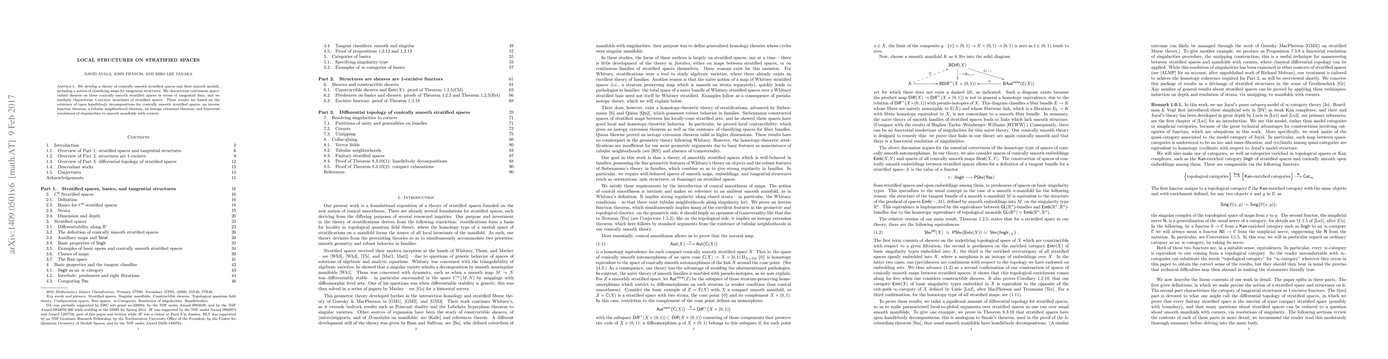 We develop a theory of conically smooth stratified spaces and their smooth moduli, including a notion of classifying maps for tangential structures. We characterize continuous space-valued sheaves on these conically smooth stratified spaces in terms of tangential data, and we similarly characterize 1-excisive invariants of stratified spaces. These results are based on the existence of open handlebody decompositions for conically smooth stratified spaces, an inverse function theorem, a tubular neighborhood theorem, an isotopy extension theorem, and functorial resolutions of singularities to smooth manifolds with corners.