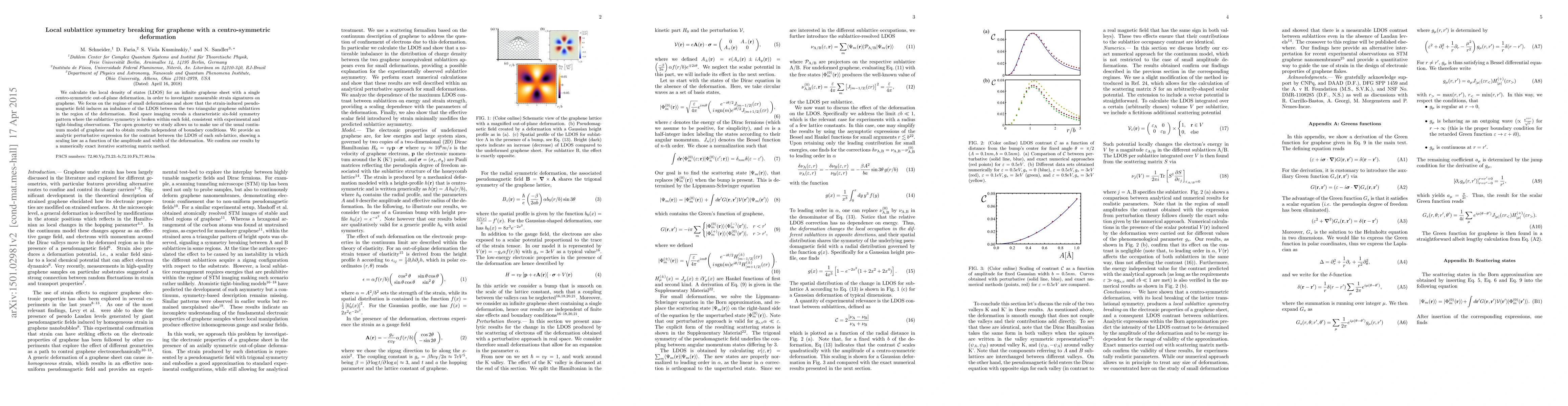 We calculate the local density of states (LDOS) for an infinite graphene sheet with a single centro-symmetric out-of-plane deformation, in order to investigate measurable strain signatures on graphene. We focus on the regime of small deformations and show that the strain-induced pseudo- magnetic field induces an imbalance of the LDOS between the two triangular graphene sublattices in the region of the deformation. Real space imaging reveals a characteristic six-fold symmetry pattern where the sublattice symmetry is broken within each fold, consistent with experimental and tight-binding observations. The open geometry we study allows us to make use of the usual continuum model of graphene and to obtain results independent of boundary conditions. We provide an analytic perturbative expression for the contrast between the LDOS of each sub-lattice, showing a scaling law as a function of the amplitude and width of the deformation. We confirm our results by a numerically exact iterative scattering matrix method.