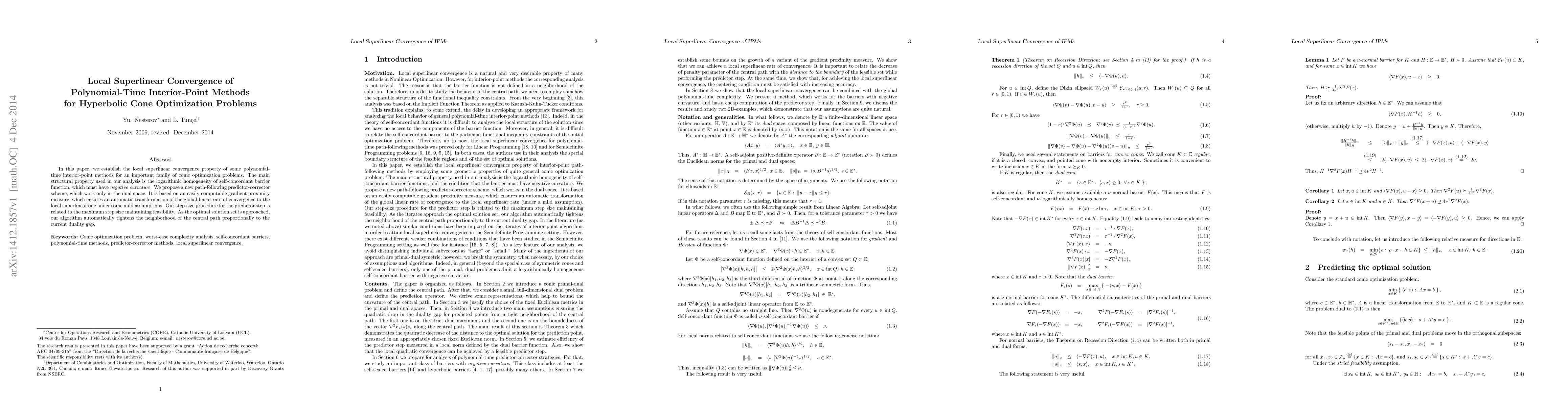 This paper establishes local superlinear convergence of a new polynomial-time interior-point method for hyperbolic cone optimization problems, leveraging logarithmic homogeneity and negative curvature properties.