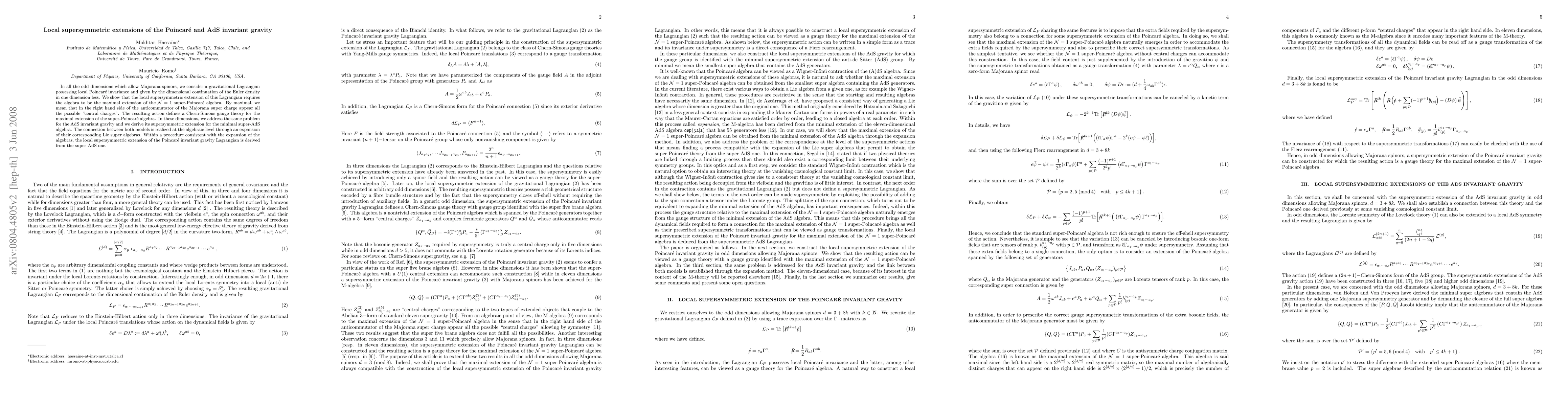 In all the odd dimensions which allow Majorana spinors, we consider a gravitational Lagrangian possessing local Poincare invariance and given by the dimensional continuation of the Euler density in one dimension less. We show that the local supersymmetric extension of this Lagrangian requires the algebra to be the maximal extension of the N=1 super-Poincare algebra. By maximal, we mean that in the right hand side of the anticommutator of the Majorana super charge appear all the possible central charges. The resulting action defines a Chern-Simons gauge theory for the maximal extension of the super-Poincare algebra. In these dimensions, we address the same problem for the AdS invariant gravity and we derive its supersymmetric extension for the minimal super-AdS algebra. The connection between both models is realized at the algebraic level through an expansion of their corresponding Lie super algebras. Within a procedure consistent with the expansion of the algebras, the local supersymmetric extension of the Poincare invariant gravity Lagrangian is derived from the super AdS one.