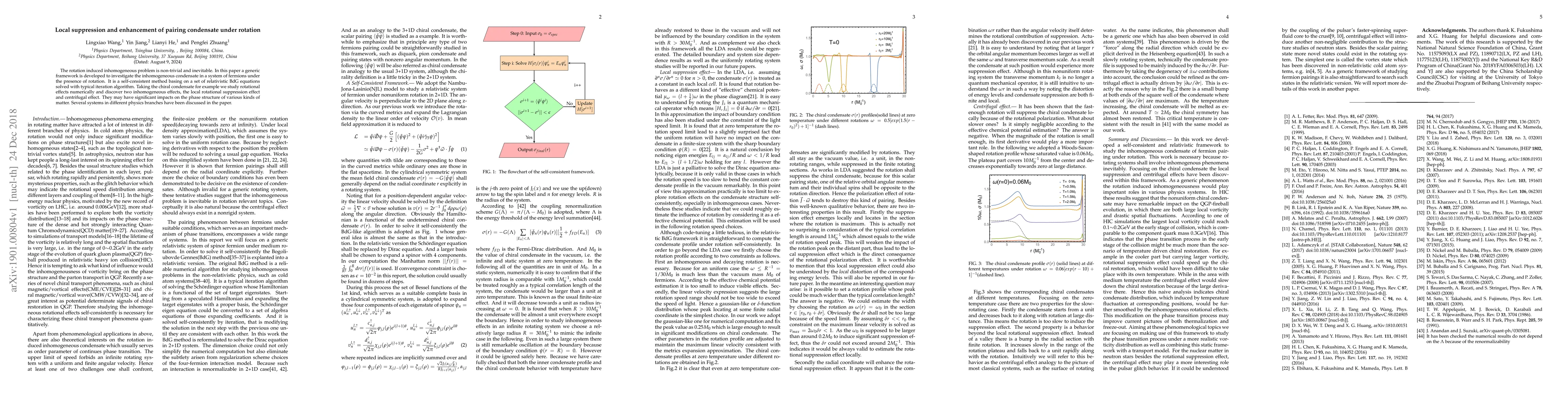 The rotation induced inhomogeneous problem is non-trivial and inevitable. In this paper a generic framework is developed to investigate the inhomogeneous condensate in a system of fermions under the presence of rotation. It is a self-consistent method basing on a set of relativistic BdG equations solved with typical iteration algorithm. Taking the chiral condensate for example we study rotational effects numerically and discover two inhomogeneous effects, the local rotational suppression effect and centrifugal effect. They may have significant impacts on the phase structure of various kinds of matter. Several systems in different physics branches have been discussed in the paper.