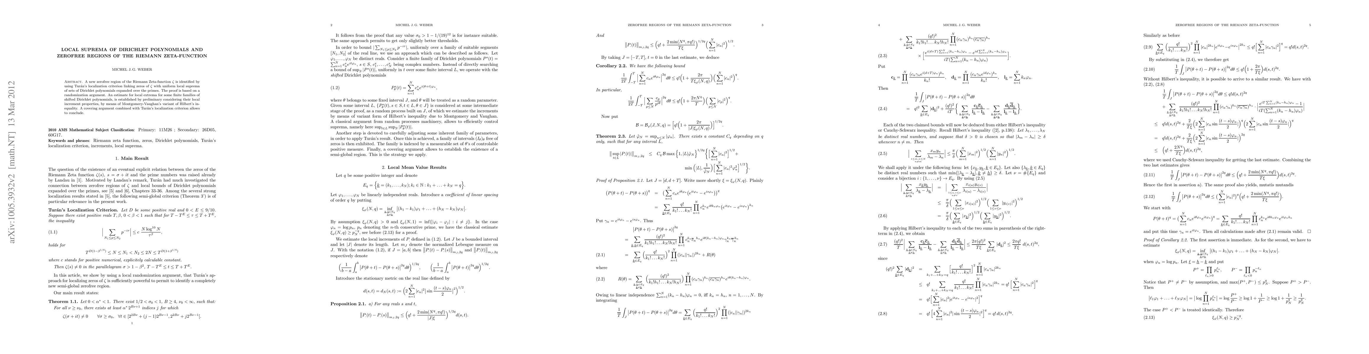 A new zerofree region of the Riemann Zeta-function $\zeta$ is identified by using Tur\'an's localization criterion linking zeros of $\zeta$ with uniform local suprema of sets of Dirichlet polynomials expanded over the primes. The proof is based on a randomization argument. An estimate for local extrema for some finite families of shifted Dirichlet polynomials, % associated to linearly independent sequences of reals is established by preliminary considering their local increment properties, by means of Montgomery-Vaughan's variant of Hilbert's inequality. A covering argument combined with Tur\'an's localization criterion allows to conclude.