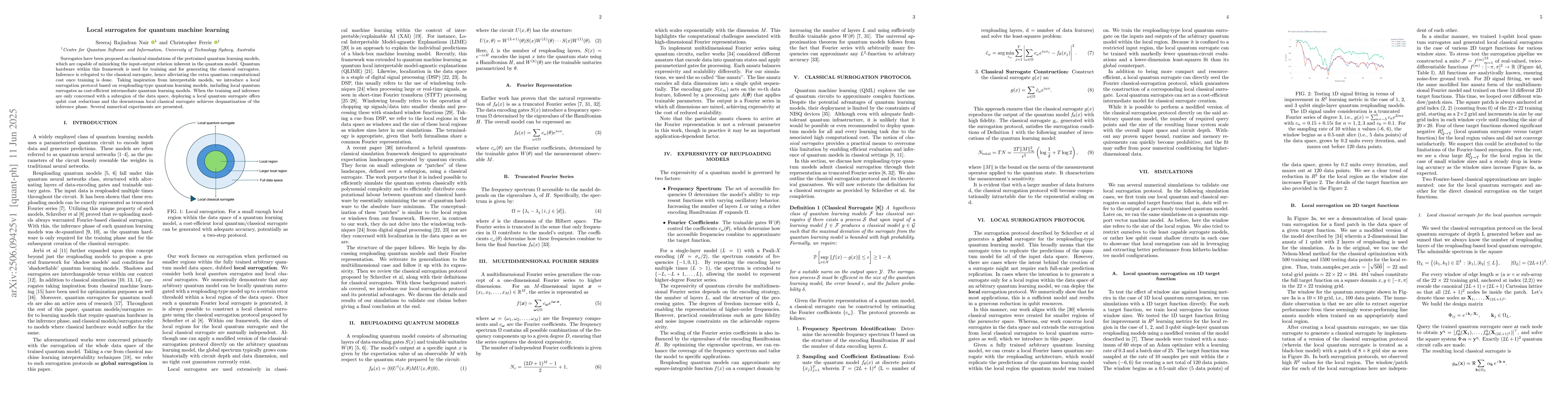 Surrogates have been proposed as classical simulations of the pretrained quantum learning models, which are capable of mimicking the input-output relation inherent in the quantum model. Quantum hardware within this framework is used for training and for generating the classical surrogates. Inference is relegated to the classical surrogate, hence alleviating the extra quantum computational cost once training is done. Taking inspiration from interpretable models, we introduce a local surrogation protocol based on reuploading-type quantum learning models, including local quantum surrogates as cost-efficient intermediate quantum learning models. When the training and inference are only concerned with a subregion of the data space, deploying a local quantum surrogate offers qubit cost reductions and the downstream local classical surrogate achieves dequantization of the inference phase. Several numerical experiments are presented.