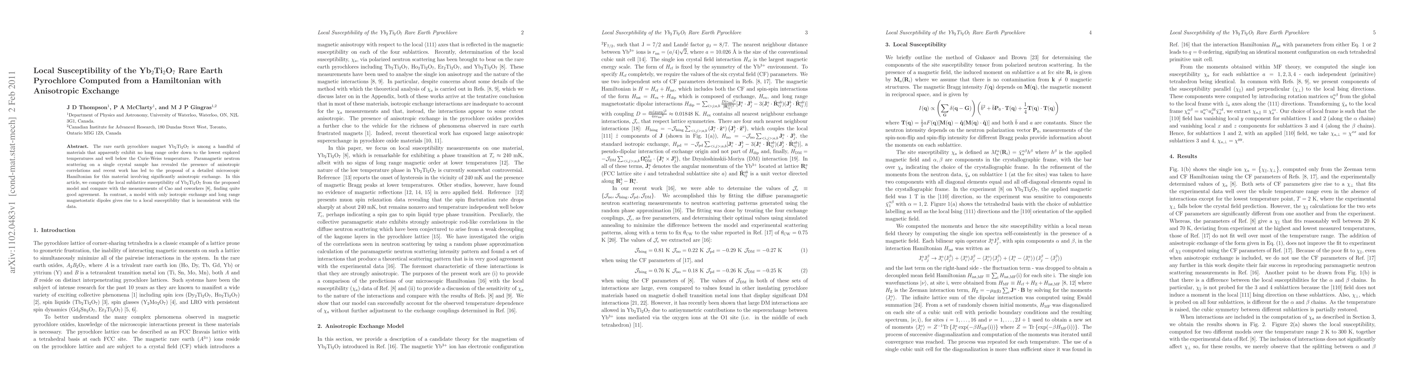 This paper computes the local susceptibility of the rare earth pyrochlore Yb2Ti2O7 using a detailed Hamiltonian with anisotropic exchange, showing good agreement with experimental measurements, while a model with only isotropic exchange fails to match the observed data.