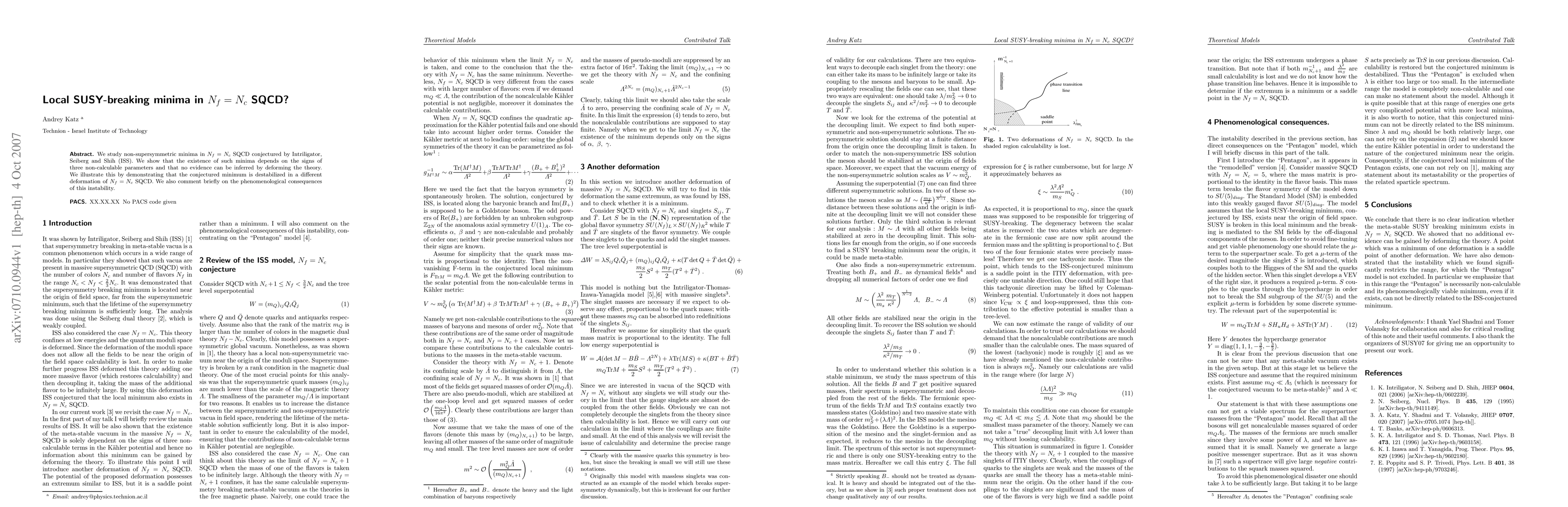 Researchers investigate the existence of local SUSY-breaking minima in a specific theoretical framework, finding that their stability depends on calculable parameters, with no evidence for their presence through deformation.