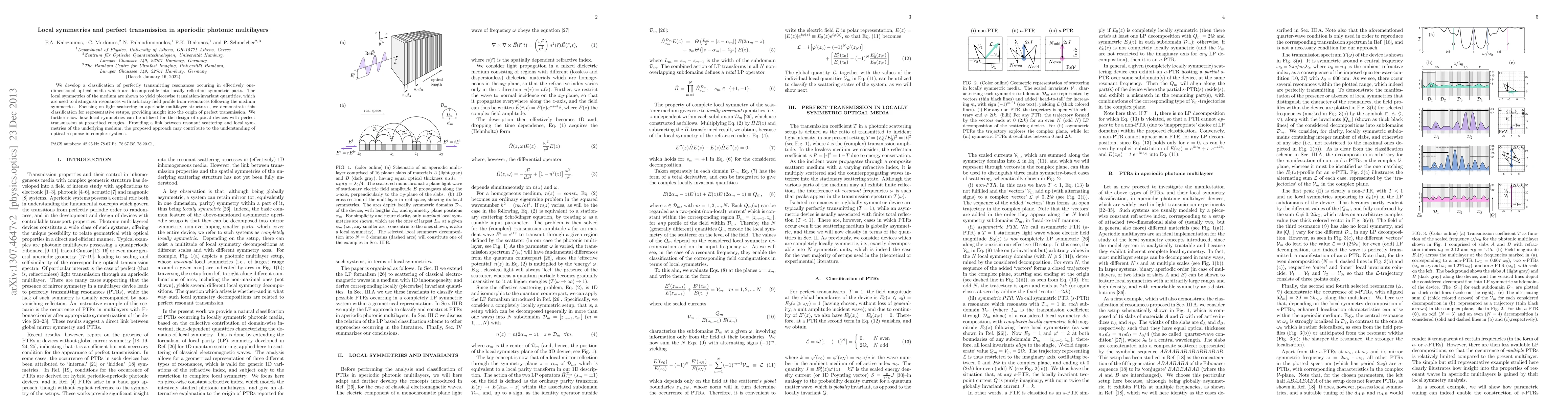 This paper classifies perfectly transmitting resonances in aperiodic photonic multilayers based on local symmetries, revealing how these symmetries lead to translation-invariant quantities. It demonstrates the practical application of this classification in designing optical devices with perfect transmission, offering insights into the optical response of complex systems.
