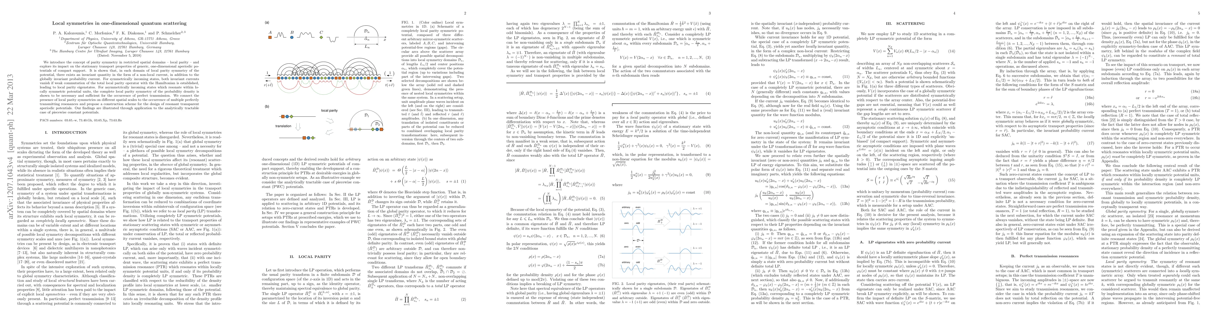 We introduce the concept of parity symmetry in restricted spatial domains -- local parity -- and explore its impact on the stationary transport properties of generic, one-dimensional aperiodic potentials of compact support. It is shown that, in each domain of local parity symmetry of the potential, there exists an invariant quantity in the form of a non-local current, in addition to the globally invariant probability current. For symmetrically incoming states, both invariant currents vanish if weak commutation of the total local parity operator with the Hamiltonian is established, leading to local parity eigenstates. For asymmetrically incoming states which resonate within locally symmetric potential units, the complete local parity symmetry of the probability density is shown to be necessary and sufficient for the occurrence of perfect transmission. We connect the presence of local parity symmetries on different spatial scales to the occurrence of multiple perfectly transmitting resonances and propose a construction scheme for the design of resonant transparent aperiodic potentials. Our findings are illustrated through application to the analytically tractable case of piecewise constant potentials.