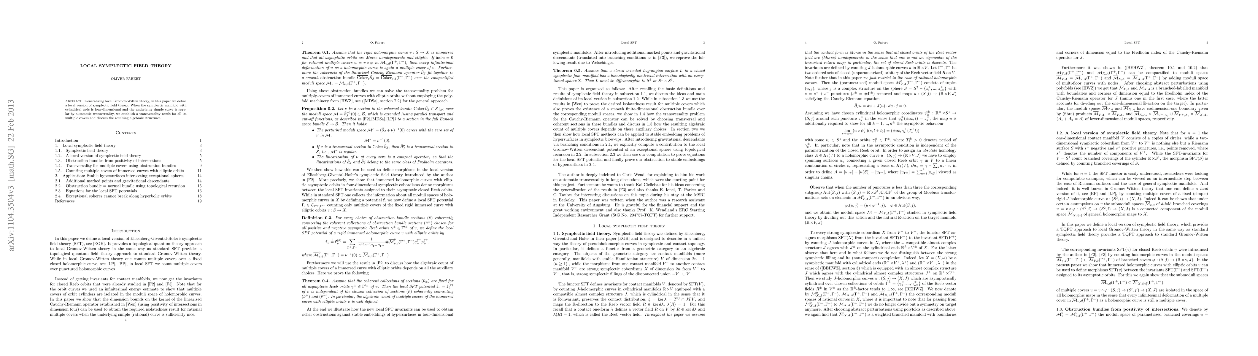 Summary: This paper generalizes local Gromov-Witten theory to define a local version of symplectic field theory, establishing transversality results for four-dimensional symplectic manifolds with cylindrical ends and exploring the resulting algebraic structures.