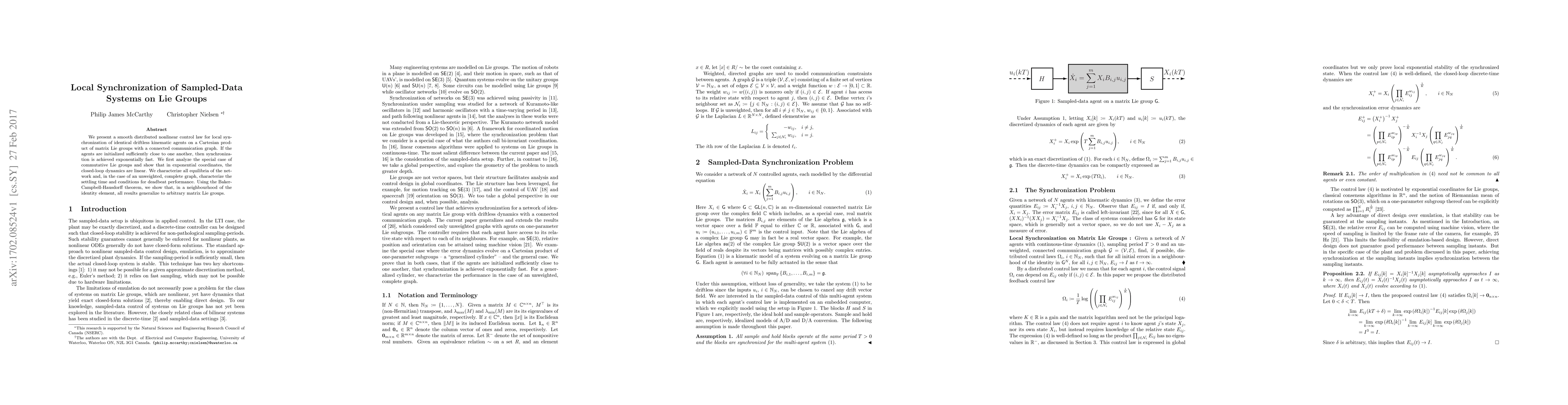 This research presents a control method for quickly synchronizing identical agents on Lie Groups, a mathematical structure used in robotics and control theory. The method works exponentially fast when agents start near each other, and it's shown to generalize to various Lie Groups using the Baker-Campbell-Hausdorff theorem.