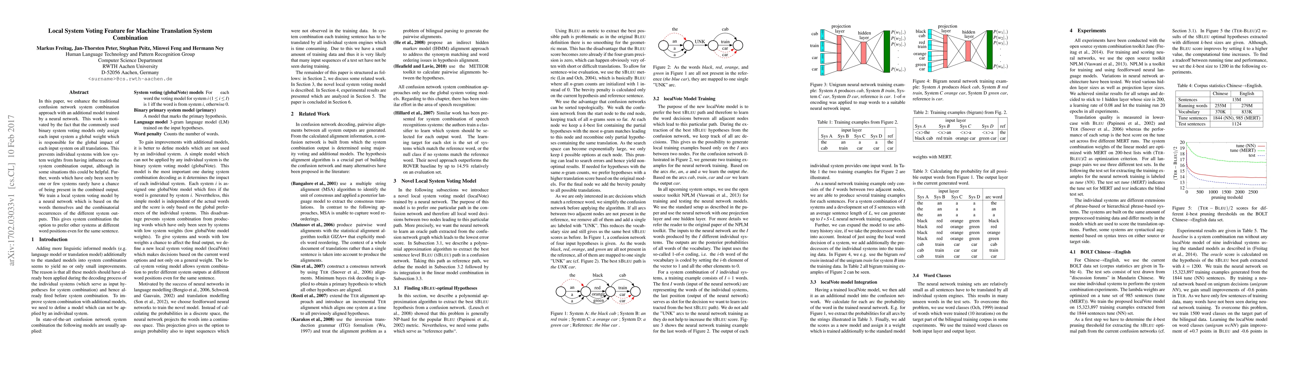 This paper introduces a local system voting model for machine translation system combination, trained by a neural network, to allow different systems to influence the output at specific word positions, addressing the limitations of global weights in traditional binary voting models. This approach aims to improve the inclusion of rare words seen by only one or few systems in the combined translation output.