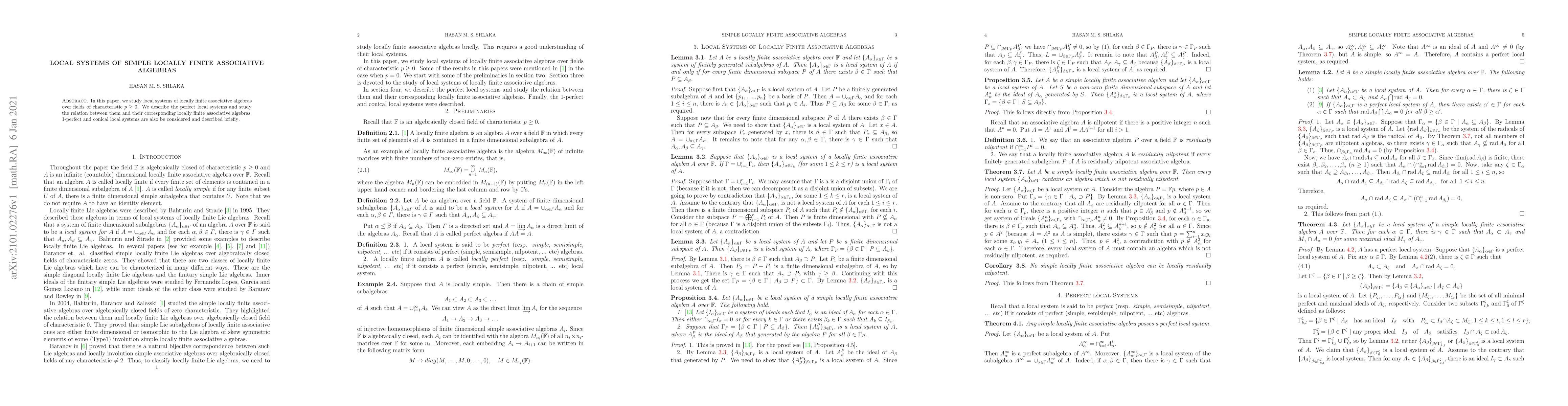 This paper explores local systems of locally finite associative algebras over fields of characteristic p ≥ 0, focusing on perfect local systems and their connections to the corresponding associative algebras. It also briefly examines 1-perfect and conical local systems.