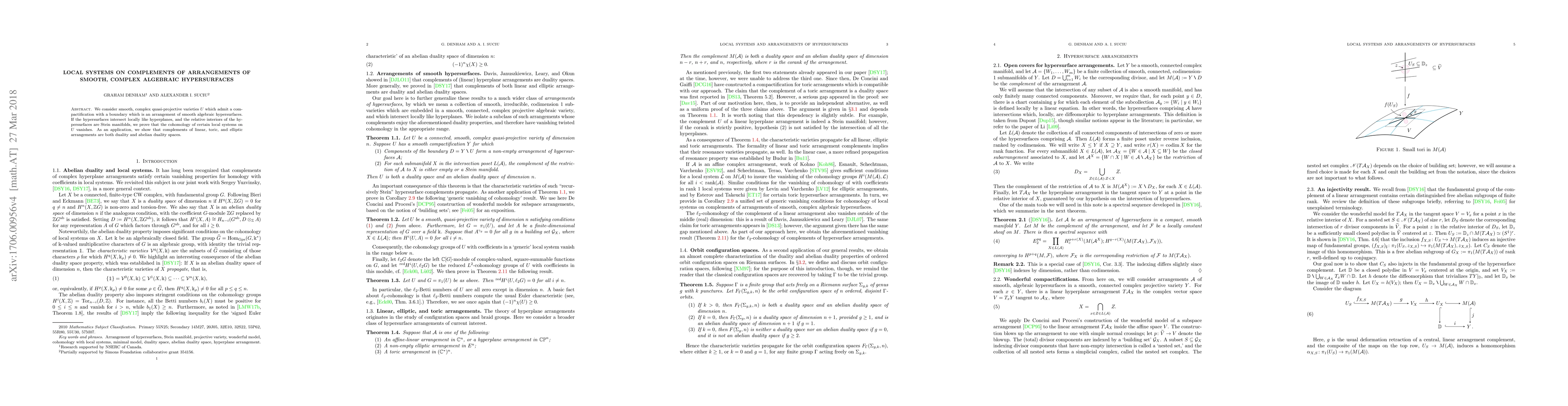 This paper demonstrates that for smooth, complex quasi-projective varieties $U$ with compactifications whose boundaries are arrangements of smooth hypersurfaces, the cohomology of specific local systems on $U$ vanishes if the hypersurfaces behave like hyperplanes locally. It further shows that complements of linear, toric, and elliptic arrangements satisfy duality properties.