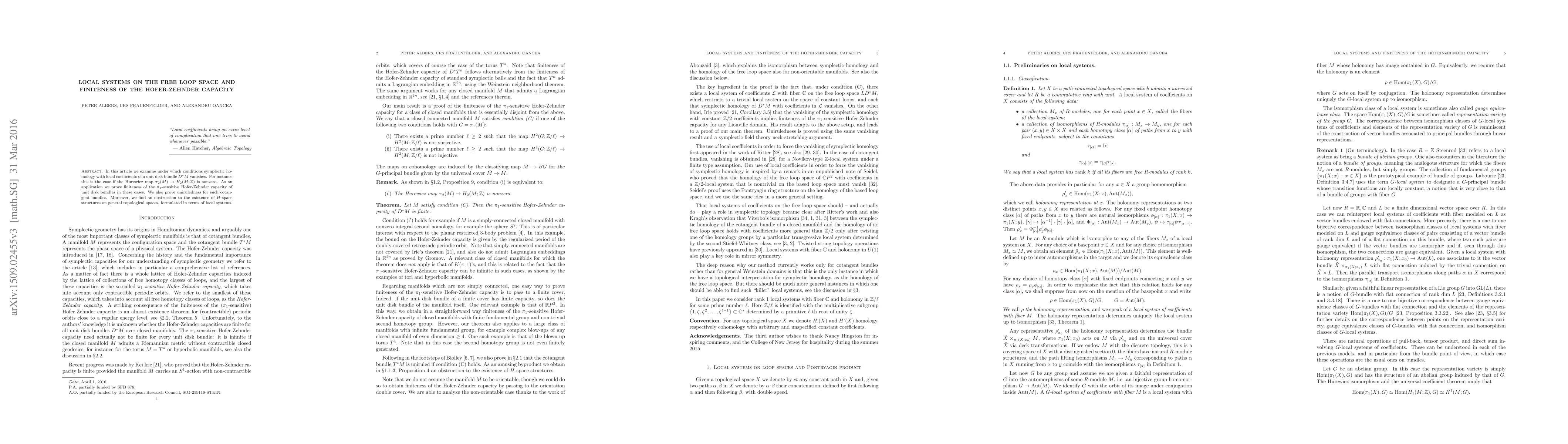 In this article we examine under which conditions symplectic homology with local coefficients of a unit disk bundle $D^*M$ vanishes. For instance this is the case if the Hurewicz map $\pi_2(M)\to H_2(M;\mathbb{Z})$ is nonzero. As an application we prove finiteness of the $\pi_1$-sensitive Hofer-Zehnder capacity of unit disk bundles in these cases. We also prove uniruledness for such cotangent bundles. Moreover, we find an obstruction to the existence of $H$-space structures on general topological spaces, formulated in terms of local systems.
