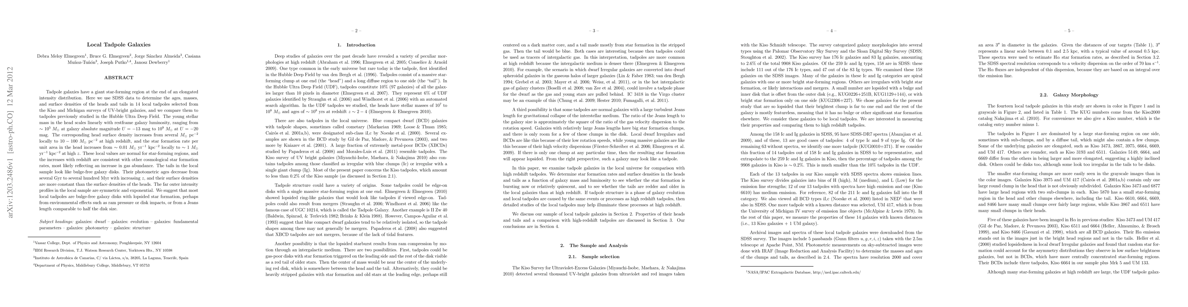 Tadpole galaxies have a giant star-forming region at the end of an elongated intensity distribution. Here we use SDSS data to determine the ages, masses, and surface densities of the heads and tails in 14 local tadpoles selected from the Kiso and Michigan surveys of UV-bright galaxies, and we compare them to tadpoles previously studied in the Hubble Ultra Deep Field. The young stellar mass in the head scales linearly with restframe galaxy luminosity, ranging from ~10^5 M_solar at galaxy absolute magnitude U=-13 mag to 10^9 M_solar at U=-20 mag. The corresponding head surface density increases from several M_solar pc^{-2} locally to 10-100 M_solar pc^{-2} at high redshift, and the star formation rate per unit area in the head increases from ~0.01 M_solar yr^{-1} kpc^{-2} locally to ~1 M_solar yr^{-1} kpc^{-2} at high z. These local values are normal for star-forming regions, and the increases with redshift are consistent with other cosmological star formation rates, most likely reflecting an increase in gas abundance. The tails in the local sample look like bulge-free galaxy disks. Their photometric ages decrease from several Gyr to several hundred Myr with increasing z, and their surface densities are more constant than the surface densities of the heads. The far outer intensity profiles in the local sample are symmetric and exponential. We suggest that most local tadpoles are bulge-free galaxy disks with lopsided star formation, perhaps from environmental effects such as ram pressure or disk impacts, or from a Jeans length comparable to half the disk size.