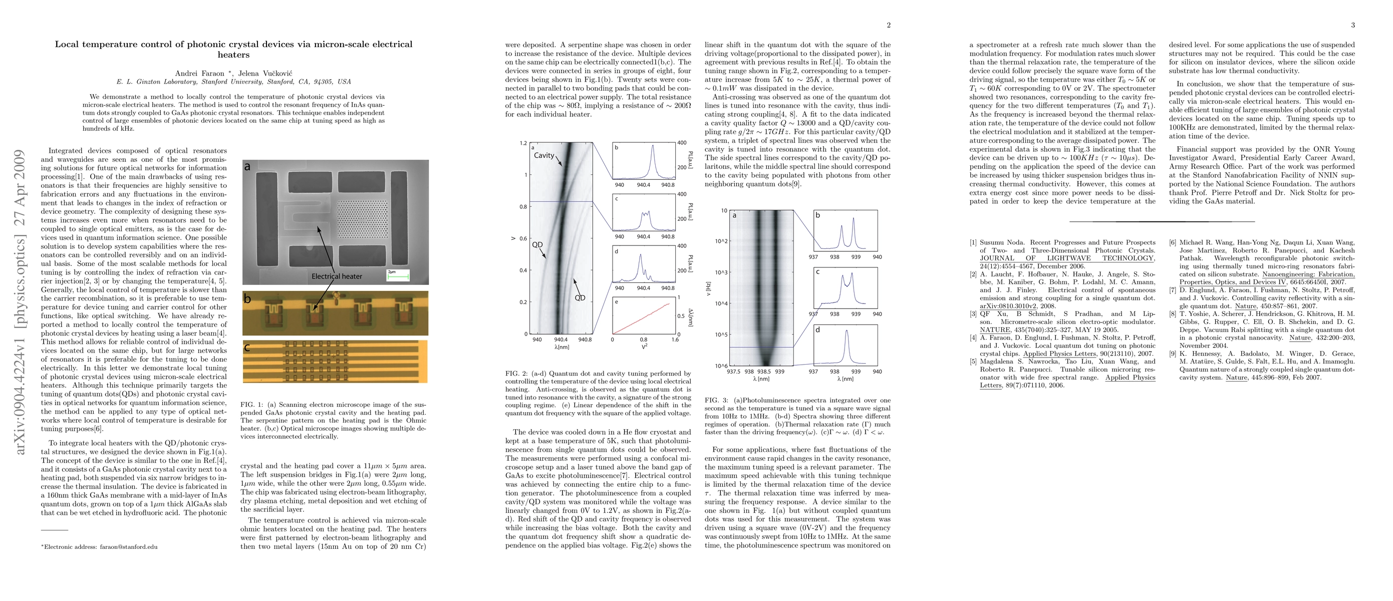 This paper presents a method for precisely controlling the temperature of photonic crystal devices using micron-scale electrical heaters, enabling tuning of the resonant frequency of InAs quantum dots coupled to GaAs photonic crystal resonators with speeds up to hundreds of kHz. This technique allows for independent control of multiple photonic devices on a single chip.