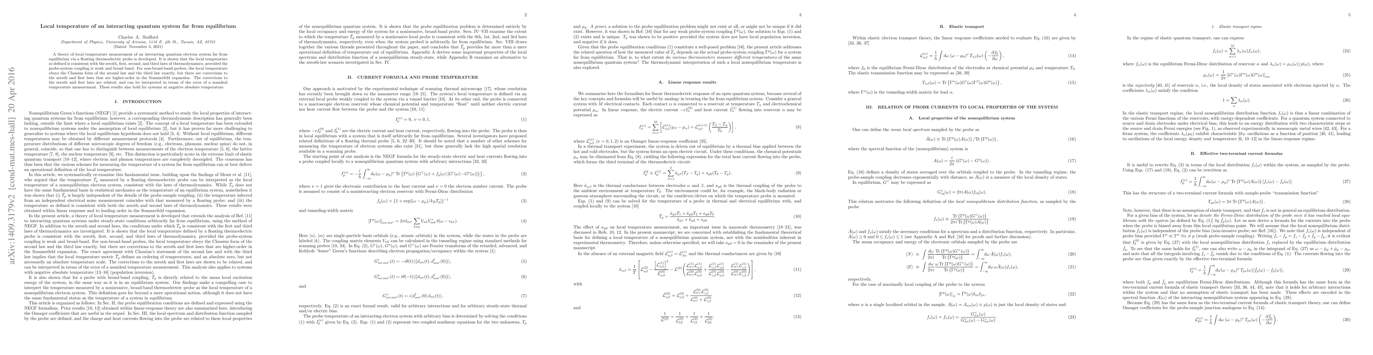 A theory of local temperature measurement of an interacting quantum electron system far from equilibrium via a floating thermoelectric probe is developed. It is shown that the local temperature so defined is consistent with the zeroth, first, second, and third laws of thermodynamics, provided the probe-system coupling is weak and broad band. For non-broad-band probes, the local temperature obeys the Clausius form of the second law and the third law exactly, but there are corrections to the zeroth and first laws that are higher-order in the Sommerfeld expansion. The corrections to the zeroth and first laws are related, and can be interpreted in terms of the error of a nonideal temperature measurement. These results also hold for systems at negative absolute temperature.
