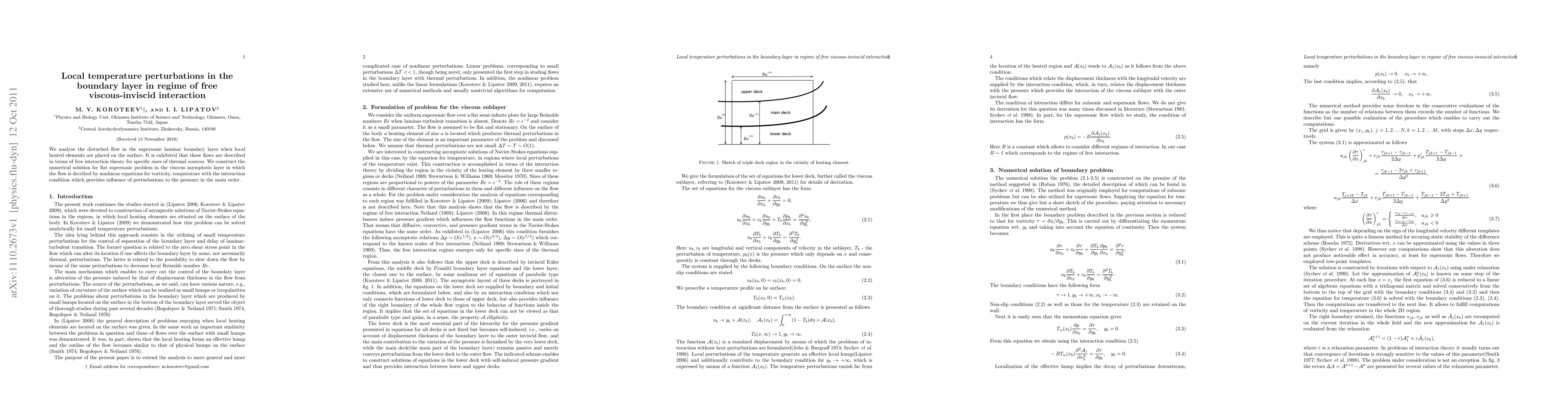 We analyze the disturbed flow in the supersonic laminar boundary layer when local heated elements are placed on the surface. It is exhibited that these flows are described in terms of free interaction theory for specific sizes of thermal sources. We construct the numerical solution for flat supersonic problem in the viscous asymptotic layer in which the flow is described by nonlinear equations for vorticity, temperature with the interaction condition which provides influence of perturbations to the pressure in the main order.