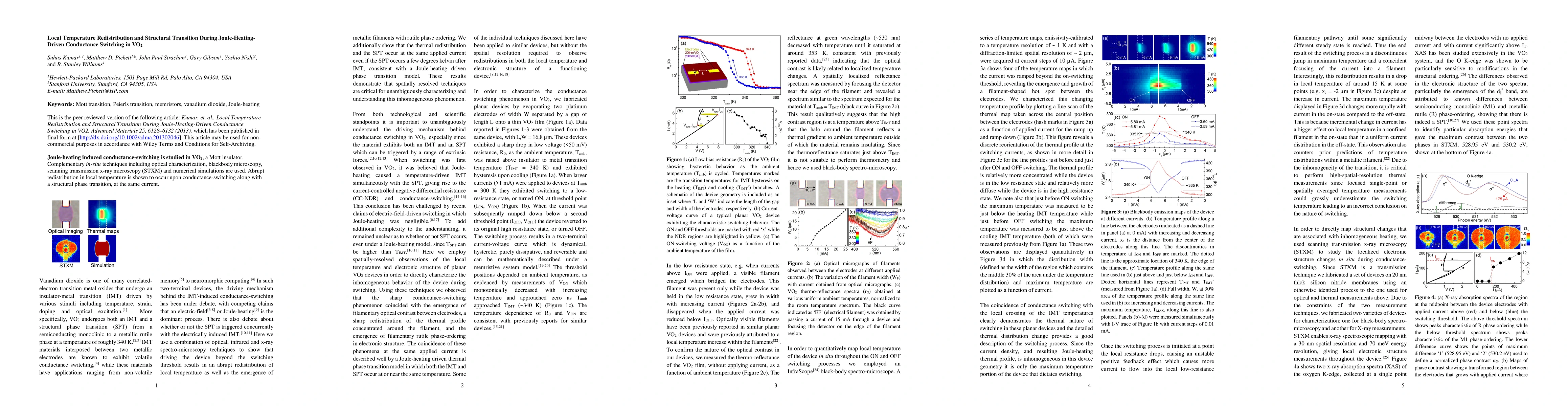 Joule-heating induced conductance-switching is studied in VO2, a Mott insulator. Complementary in-situ techniques including optical characterization, blackbody microscopy, scanning transmission x-ray microscopy (STXM) and numerical simulations are used. Abrupt redistribution in local temperature is shown to occur upon conductance-switching along with a structural phase transition, at the same current.