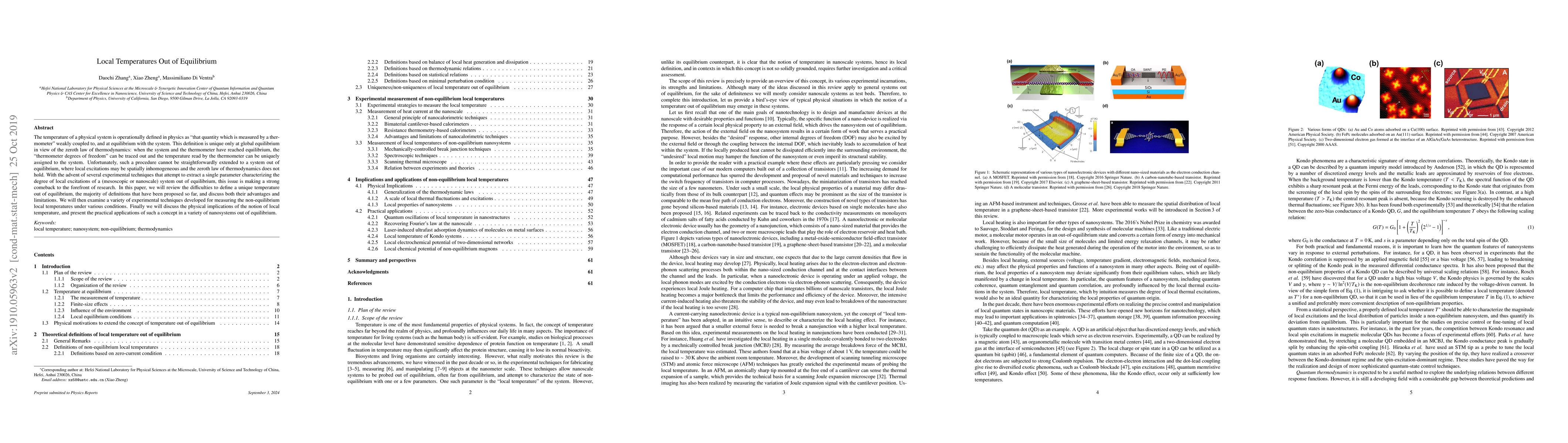 The temperature of a physical system is operationally defined in physics as "that quantity which is measured by a thermometer" weakly coupled to, and at equilibrium with the system. This definition is unique only at global equilibrium in view of the zeroth law of thermodynamics: when the system and the thermometer have reached equilibrium, the "thermometer degrees of freedom" can be traced out and the temperature read by the thermometer can be uniquely assigned to the system. Unfortunately, such a procedure cannot be straightforwardly extended to a system out of equilibrium, where local excitations may be spatially inhomogeneous and the zeroth law of thermodynamics does not hold. With the advent of several experimental techniques that attempt to extract a single parameter characterizing the degree of local excitations of a (mesoscopic or nanoscale) system out of equilibrium, this issue is making a strong comeback to the forefront of research. In this paper, we will review the difficulties to define a unique temperature out of equilibrium, the majority of definitions that have been proposed so far, and discuss both their advantages and limitations. We will then examine a variety of experimental techniques developed for measuring the non-equilibrium local temperatures under various conditions. Finally we will discuss the physical implications of the notion of local temperature, and present the practical applications of such a concept in a variety of nanosystems out of equilibrium.