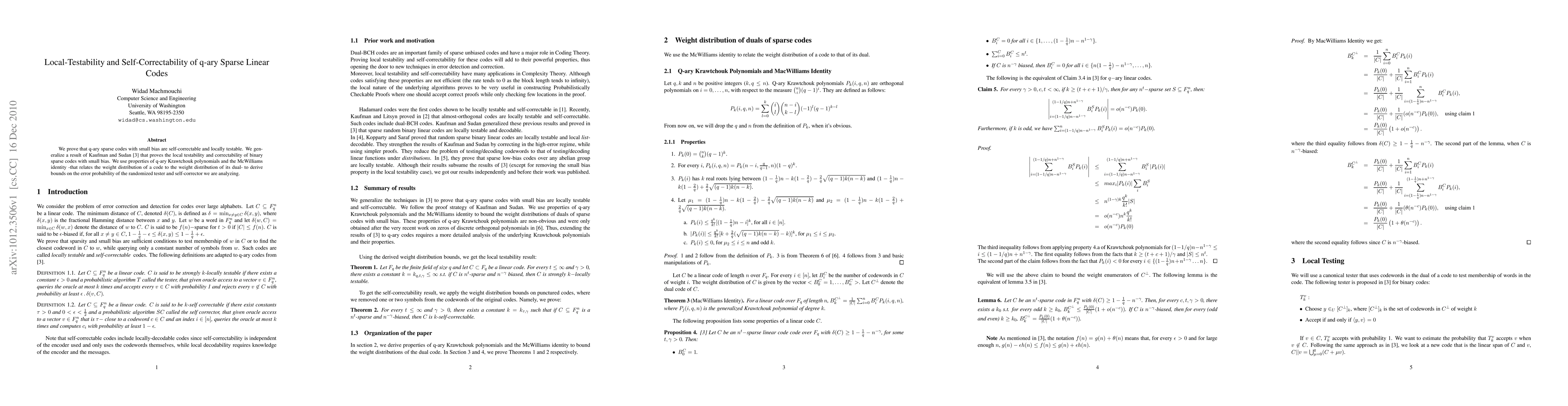 We prove that q-ary sparse codes with small bias are self-correctable and locally testable. We generalize a result of Kaufman and Sudan that proves the local testability and correctability of binary sparse codes with small bias. We use properties of q-ary Krawtchouk polynomials and the McWilliams identity -that relates the weight distribution of a code to the weight distribution of its dual- to derive bounds on the error probability of the randomized tester and self-corrector we are analyzing.