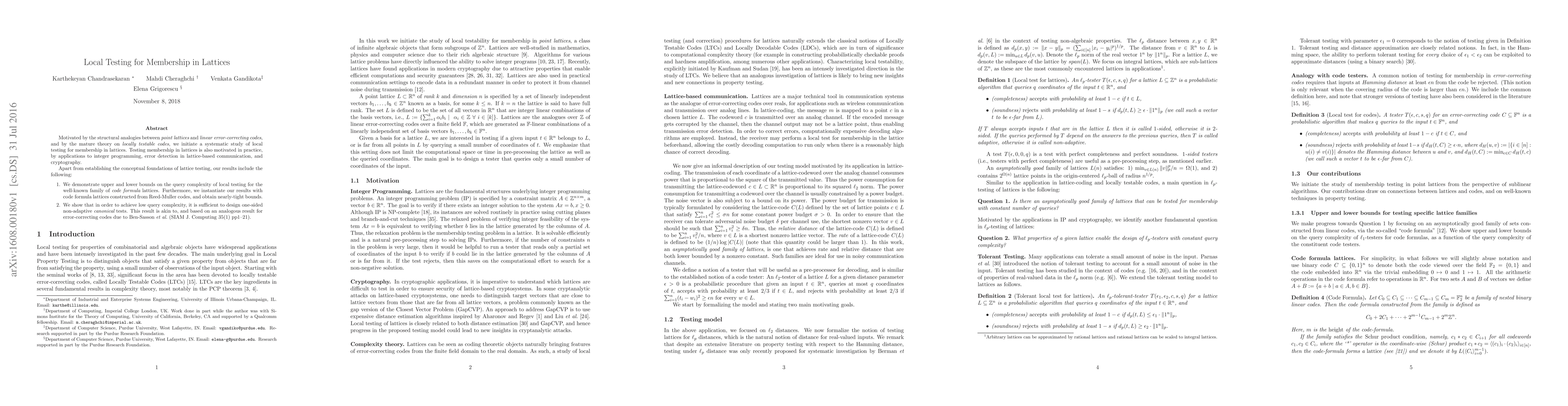 This paper initiates a systematic study of local testing for membership in lattices, drawing parallels to locally testable codes and addressing practical applications in integer programming, communication, and cryptography. The authors establish upper and lower bounds on query complexity for lattice testing, particularly for code lattices derived from Reed-Muller codes, and demonstrate that low query complexity can be achieved using one-sided non-adaptive canonical tests.