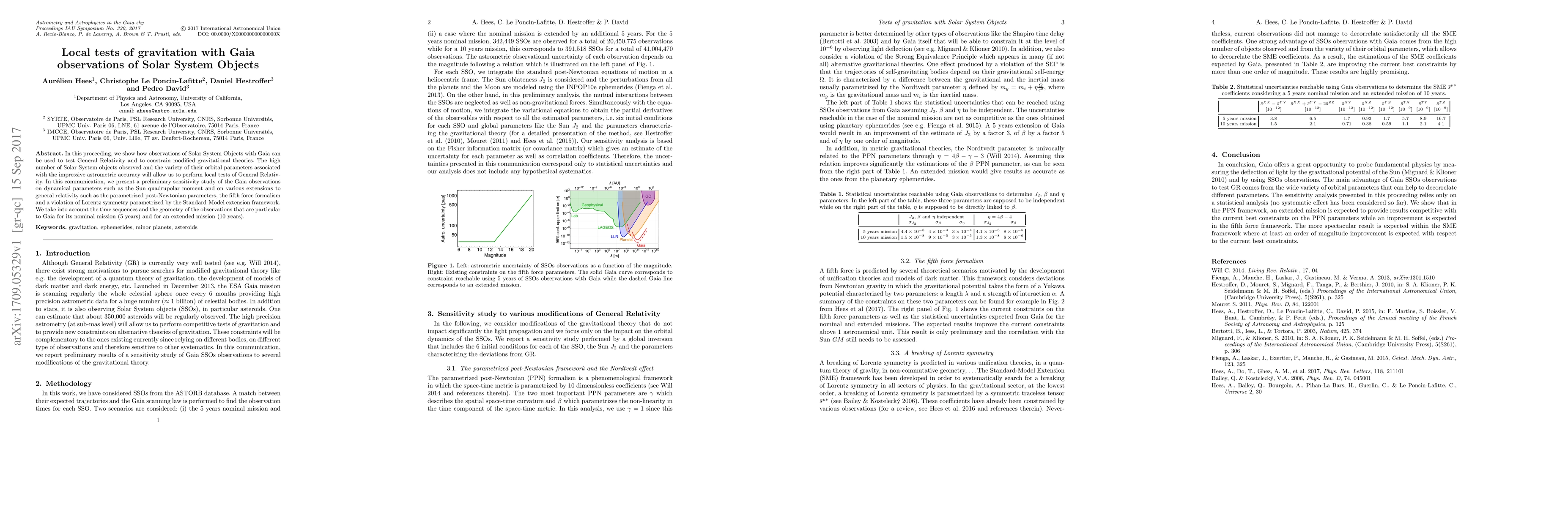 In this proceeding, we show how observations of Solar System Objects with Gaia can be used to test General Relativity and to constrain modified gravitational theories. The high number of Solar System objects observed and the variety of their orbital parameters associated with the impressive astrometric accuracy will allow us to perform local tests of General Relativity. In this communication, we present a preliminary sensitivity study of the Gaia observations on dynamical parameters such as the Sun quadrupolar moment and on various extensions to general relativity such as the parametrized post-Newtonian parameters, the fifth force formalism and a violation of Lorentz symmetry parametrized by the Standard-Model extension framework. We take into account the time sequences and the geometry of the observations that are particular to Gaia for its nominal mission (5 years) and for an extended mission (10 years).