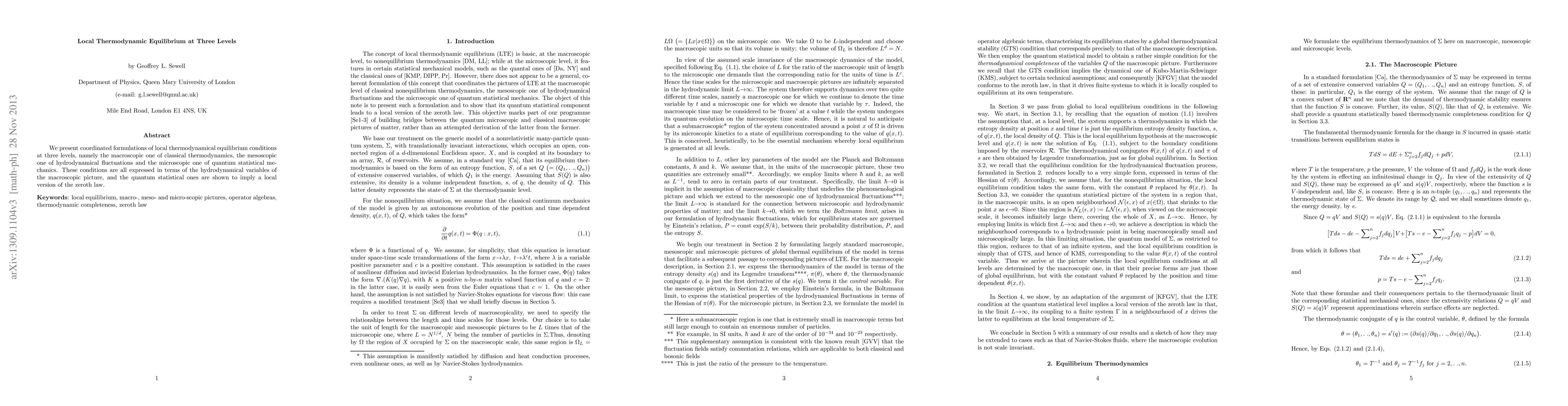 We present coordinated formulations of local thermodynamical equilibrium conditions at three levels, namely the macroscopic one of classical thermodynamics, the mesoscopic one of hydrodynamical fluctuations and the microscopic one of quantum statistical mechanics. These conditions are all expressed in terms of the hydrodynamical variables of the macroscopic picture, and the quantum statistical ones are shown to imply a local version of the zeroth law.